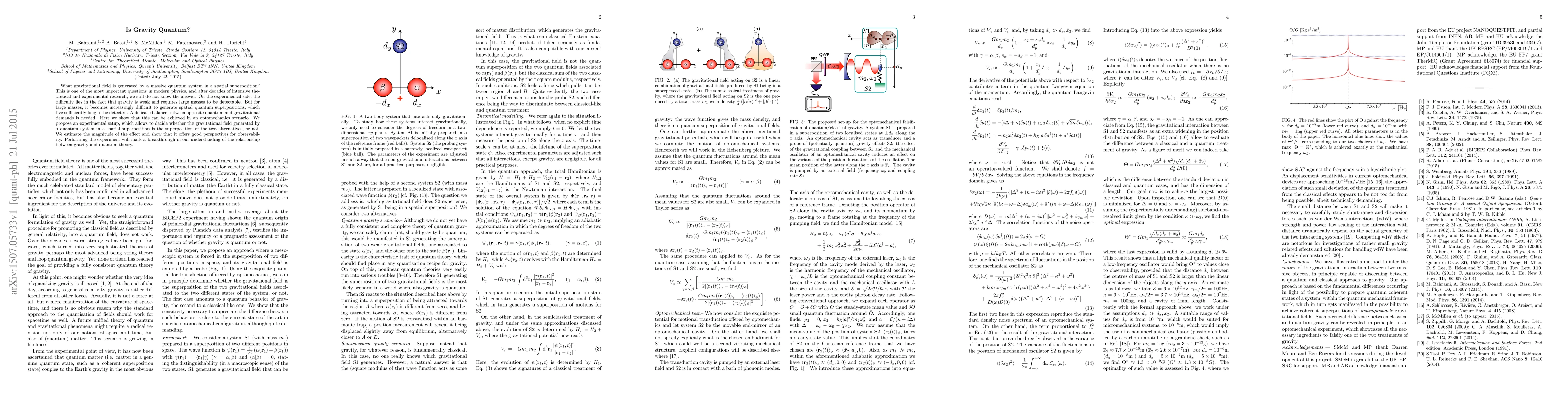 What gravitational field is generated by a massive quantum system in a spatial superposition? This is one of the most important questions in modern physics, and after decades of intensive theoretical and experimental research, we still do not know the answer. On the experimental side, the difficulty lies in the fact that gravity is weak and requires large masses to be detectable. But for large masses, it becomes increasingly difficult to generate spatial quantum superpositions, which live sufficiently long to be detected. A delicate balance between opposite quantum and gravitational demands is needed. Here we show that this can be achieved in an optomechanics scenario. We propose an experimental setup, which allows to decide whether the gravitational field generated by a quantum system in a spatial superposition is the superposition of the two alternatives, or not. We estimate the magnitude of the effect and show that it offers good perspectives for observability. Performing the experiment will mark a breakthrough in our understanding of the relationship between gravity and quantum theory.