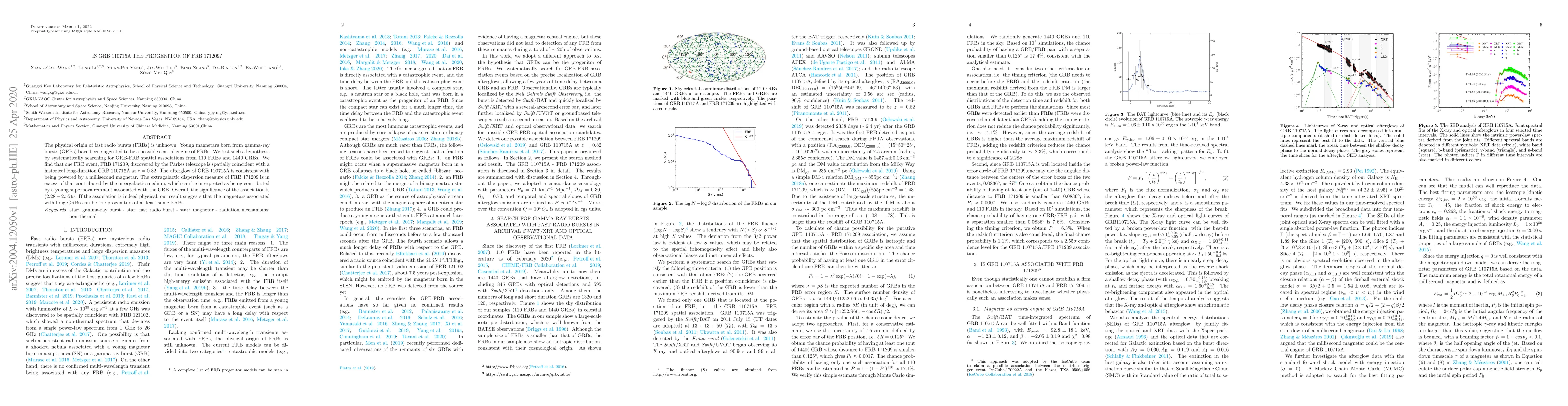 The physical origin of fast radio bursts (FRBs) is unknown. Young magnetars born from gamma-ray bursts (GRBs) have been suggested to be a possible central engine of FRBs. We test such a hypothesis by systematically searching for GRB-FRB spatial associations from 110 FRBs and 1440 GRBs. We find that one FRB event, FRB 171209, discovered by the Parkes telescope is spatially coincident with a historical long-duration GRB 110715A at $z=0.82$. The afterglow of GRB 110715A is consistent with being powered by a millisecond magnetar. The extragalactic dispersion measure of FRB 171209 is in excess of that contributed by the intergalactic medium, which can be interpreted as being contributed by a young supernova remnant associated with the GRB. Overall, the significance of the association is $(2.28 - 2.55) \sigma$. If the association is indeed physical, our result suggests that the magnetars associated with long GRBs can be the progenitors of at least some FRBs.