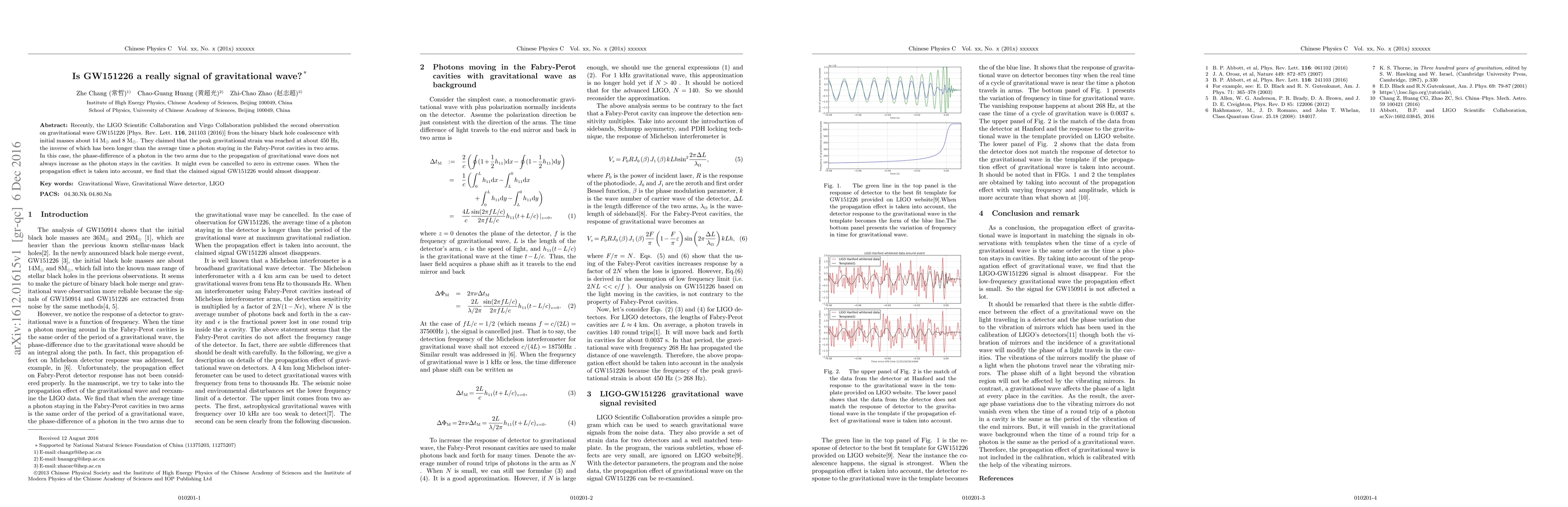 Recently, the LIGO Scientific Collaboration and Virgo Collaboration published the second observation on gravitational wave GW151226 [Phys. Rev. Lett. 116, 241103 (2016)] from the binary black hole coalescence with initial masses about 14 M$_\odot$ and 8 M$_\odot$. They claimed that the peak gravitational strain was reached at about 450 Hz, the inverse of which has been longer than the average time a photon staying in the Fabry-Perot cavities in two arms. In this case, the phase-difference of a photon in the two arms due to the propagation of gravitational wave does not always increase as the photon stays in the cavities. It might even be cancelled to zero in extreme cases. When the propagation effect is taken into account, we find that the claimed signal GW151226 would almost disappear.