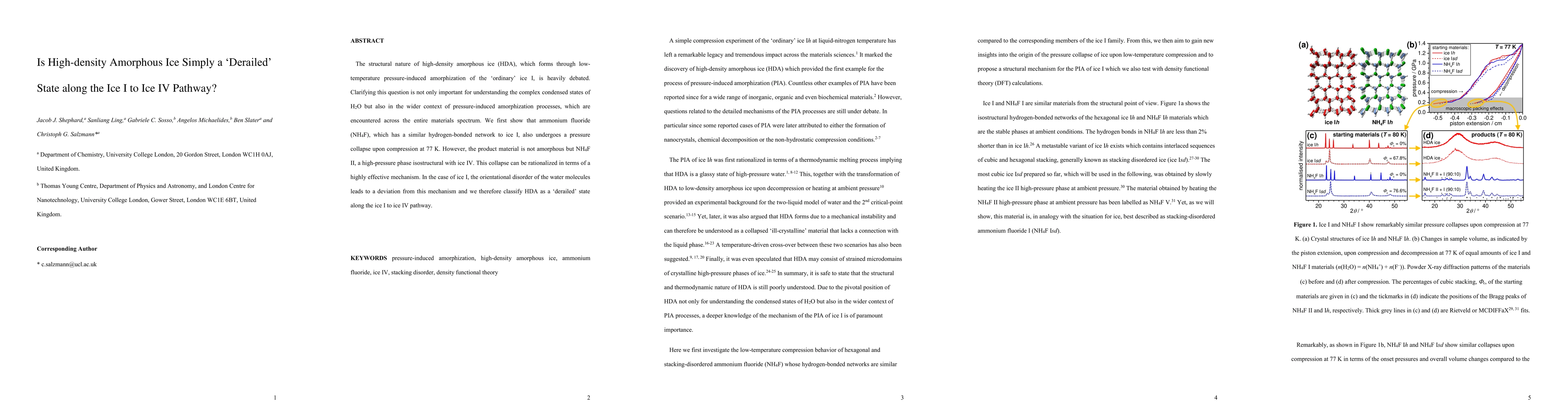 This paper investigates the structural nature of high-density amorphous ice (HDA), suggesting it forms due to the orientational disorder of water molecules, classifying it as a 'derailed' state diverging from the ice I to ice IV pathway. The study also compares this behavior to ammonium fluoride, which follows a different pressure-induced pathway, forming a high-pressure phase similar to ice IV.
