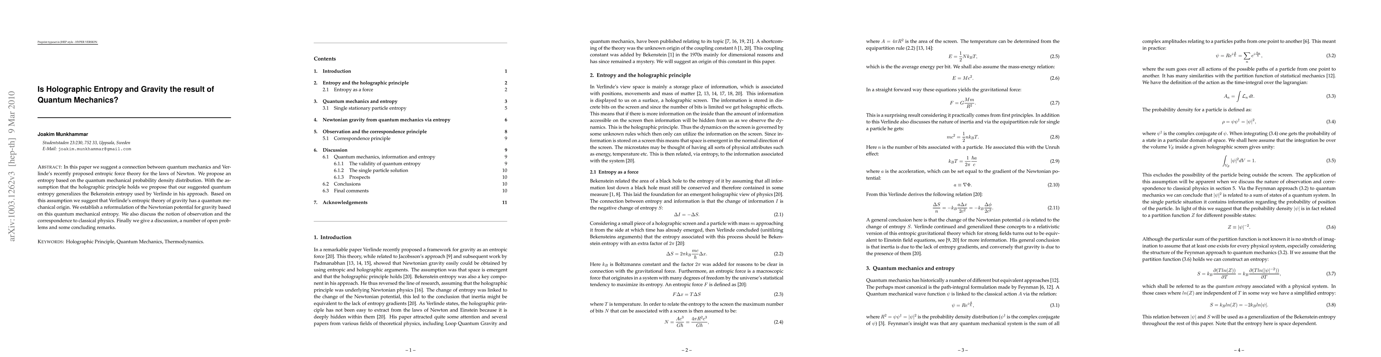 In this paper we suggest a connection between quantum mechanics and Verlinde's recently proposed entropic force theory for the laws of Newton. We propose an entropy based on the quantum mechanical probability density distribution. With the assumption that the holographic principle holds we propose that our suggested quantum entropy generalizes the Bekenstein entropy used by Verlinde in his approach. Based on this assumption we suggest that Verlinde's entropic theory of gravity has a quantum mechanical origin. We establish a reformulation of the Newtonian potential for gravity based on this quantum mechanical entropy. We also discuss the notion of observation and the correspondence to classical physics. Finally we give a discussion, a number of open problems and some concluding remarks.