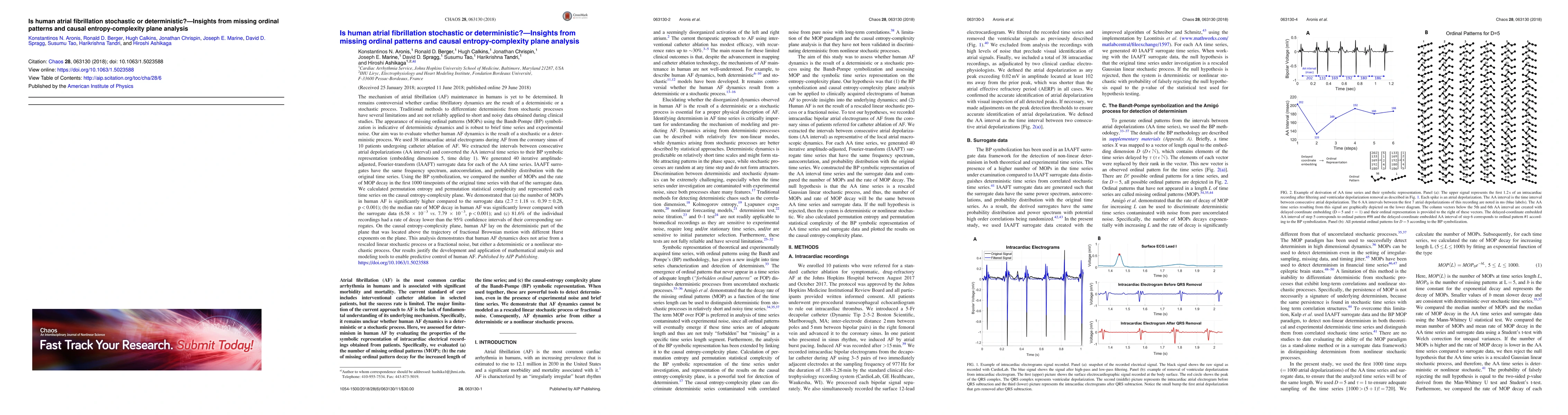 Atrial fibrillation (AF) is the most common cardiac arrhythmia in human beings, and is associated with significant morbidity and mortality. The current standard of care includes interventional catheter ablation in selected patients, but the success rate is limited. The major limitation of the current approach to AF is the lack of fundamental understanding of its underlying mechanism. Specifically, it remains unclear whether human AF dynamics are a deterministic or a stochastic process. Here we assess for determinism in human AF by evaluating the properties of the symbolic representation of intracardiac electrical recordings obtained from patients. Specifically, we evaluate (a) the number of the missing ordinal patterns, (b) the rate of missing ordinal pattern decay for increased length of the time series, and (c) the causal-entropy complexity plane of the Bandt-Pompe symbolic representation. When used together, these are powerful tools to detect determinism, even in the presence of experimental noise and brief time series.