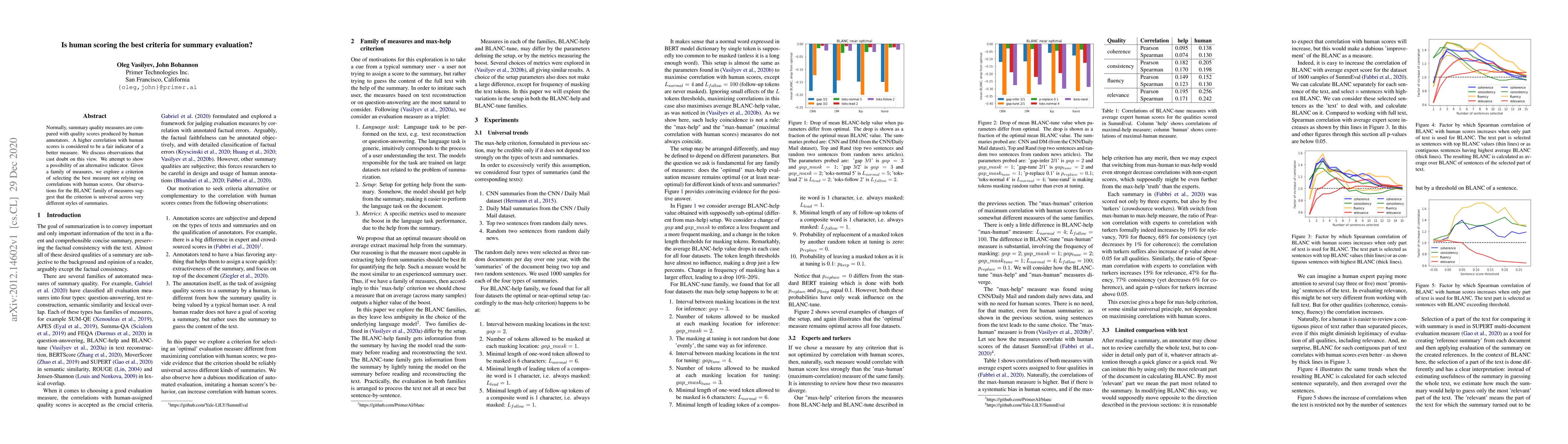 Researchers question the reliance on human scoring for evaluating summary quality, proposing a universal criterion to select the best measure that doesn't depend on correlations with human scores.