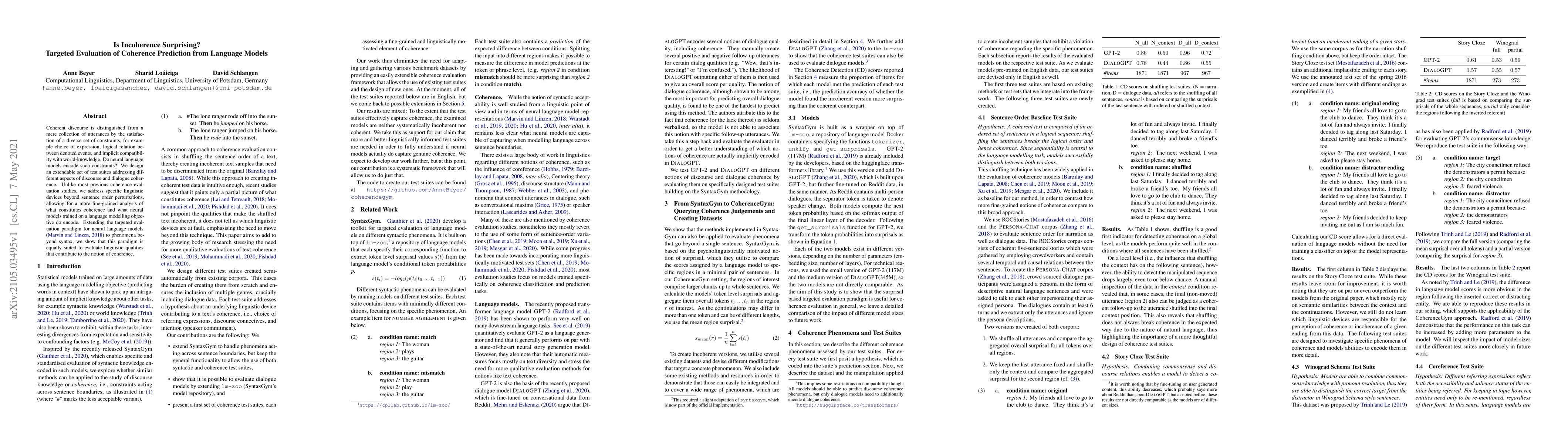 This study evaluates whether neural language models encode coherence constraints, such as logical relations and world-knowledge compatibility, in a targeted way. It shows that the paradigm is equally suited to evaluate linguistic qualities contributing to coherence beyond syntax.