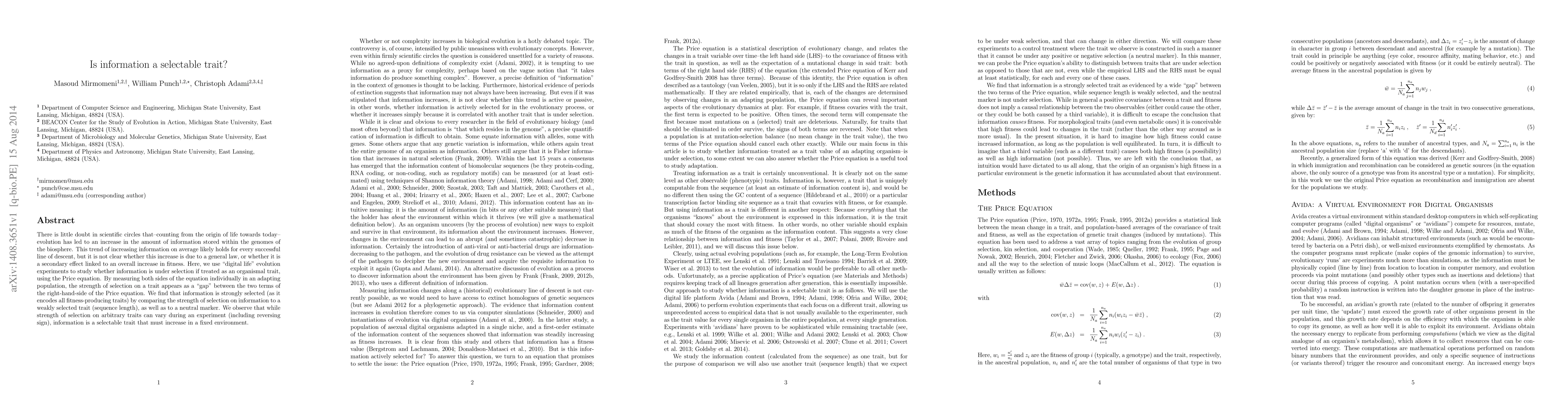 This paper investigates whether information stored in genomes is a selectable trait through digital evolution experiments. It finds that information, which encodes fitness-producing traits, is strongly selected and must increase in a stable environment, contrasting with weakly selected traits like sequence length.