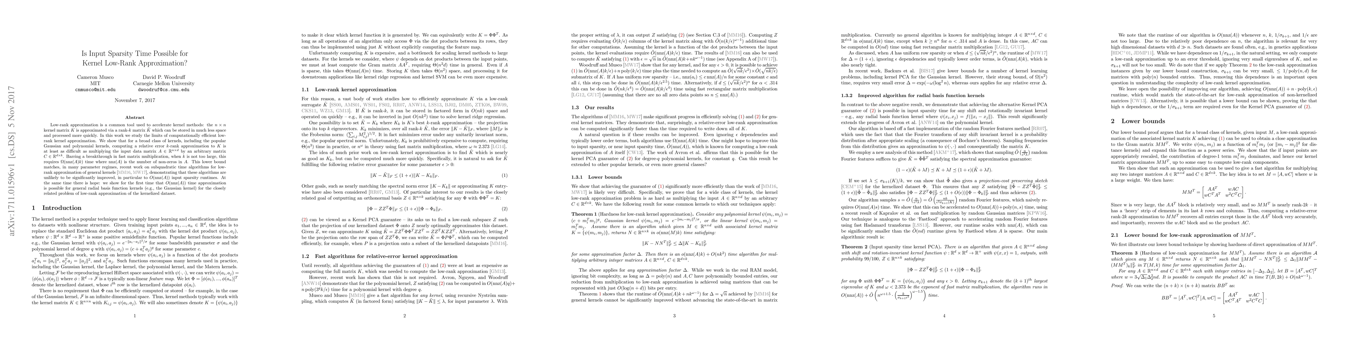 This paper investigates the computational efficiency of low-rank kernel approximation, showing that achieving $O(nnz(A))$ time complexity is unlikely for general kernels. It demonstrates that for popular kernels like Gaussian and polynomial, achieving a $k$-rank approximation requires $\Omega(nnz(A)k)$ time, matching recent subquadratic algorithms. However, it also reveals that for radial basis function kernels, $O(nnz(A))$ time complexity is feasible for kernelized dataset approximation.