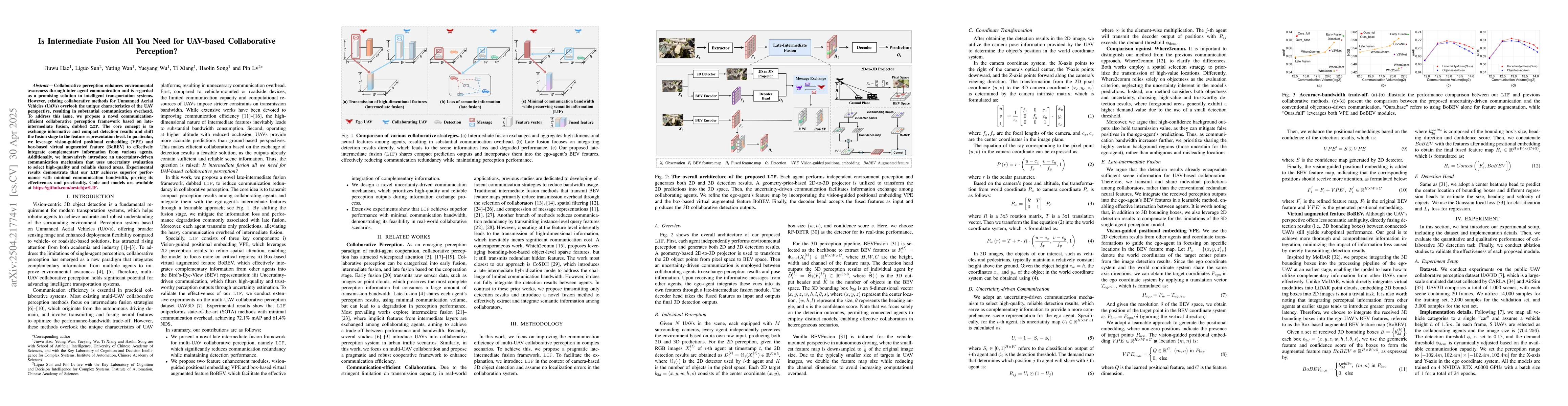 The research proposes a novel communication-efficient collaborative perception framework, LIF, based on late-intermediate fusion for UAVs, utilizing vision-guided positional embedding (VPE) and box-based virtual augmented feature (BoBEV) along with an uncertainty-driven communication mechanism.