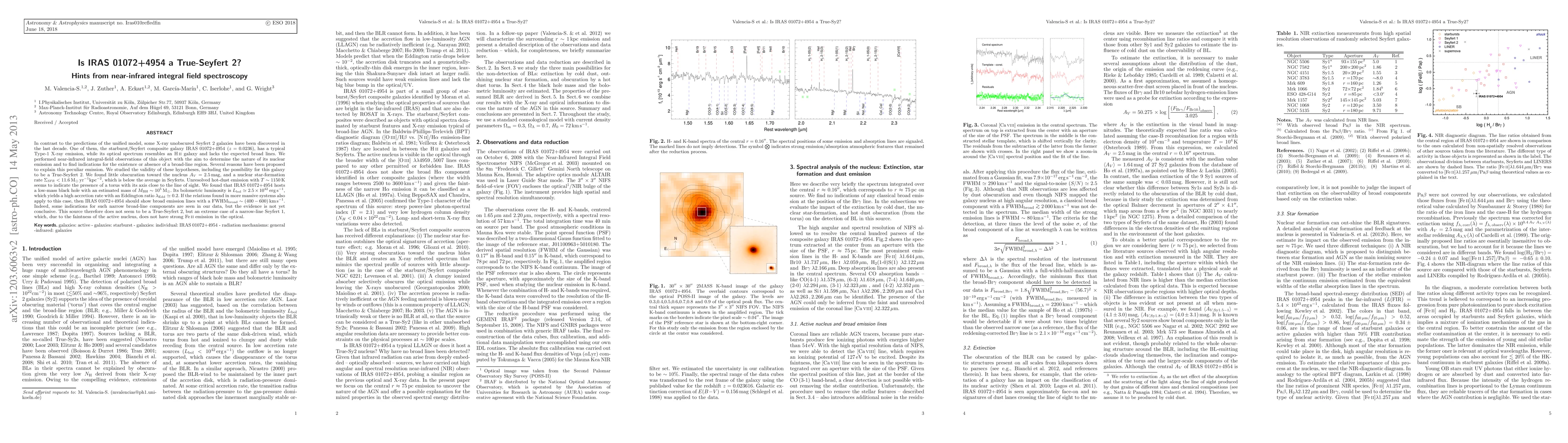In contrast to the predictions of the unified model, some X-ray unobscured Seyfert 2 galaxies have been discovered in the last decade. One of them, the starburst/Seyfert composite galaxy IRAS 01072+4954 (z=0.0236), has a typical Type~1 X-ray emission, while its optical spectrum resembles an HII galaxy and lacks the expected broad lines. We performed near-infrared integral-field observations of this object with the aim to determine the nature of its nuclear emission and to find indications for the existence or absence of a broad-line region. Several reasons have been proposed to explain such peculiar emission. We studied the validity of such hypotheses, including the possibility for it to be True-Seyfert~2. We found little obscuration towards the nucleus A_V = 2.5 mag, and a nuclear star-formation rate Sigma_SFR < 11.6 Msun yr^{-1} kpc^{-2}, which is below the average in Seyferts. Unresolved hot-dust emission with T ~ 1150 K seems to indicate the presence of a torus with its axis close to the line of sight. We found that IRAS 01072+4954 hosts a low mass black hole with an estimated mass of M_BH ~ 10^5 Msun and an upper limit of 2.5x10^6 Msun. Its bolometric luminosity is L_bol ~ 2.5x10^{42} erg/s, which yields a high accretion rate with an Eddington ratio ~ 0.2. If the relations found in more massive systems also apply to this case, then IRAS 01072+4954 should show broad emission lines with FWHM_{broad} ~(400-600) km/s. Indeed, some indications for such narrow broad-line components are seen in our data, but the evidence is not yet conclusive. This source thus seems not to be a True-Seyfert 2, but an extreme case of a narrow line Seyfert 1, which, due to the faintness of the active nucleus, does not have strong FeII emission in the optical.