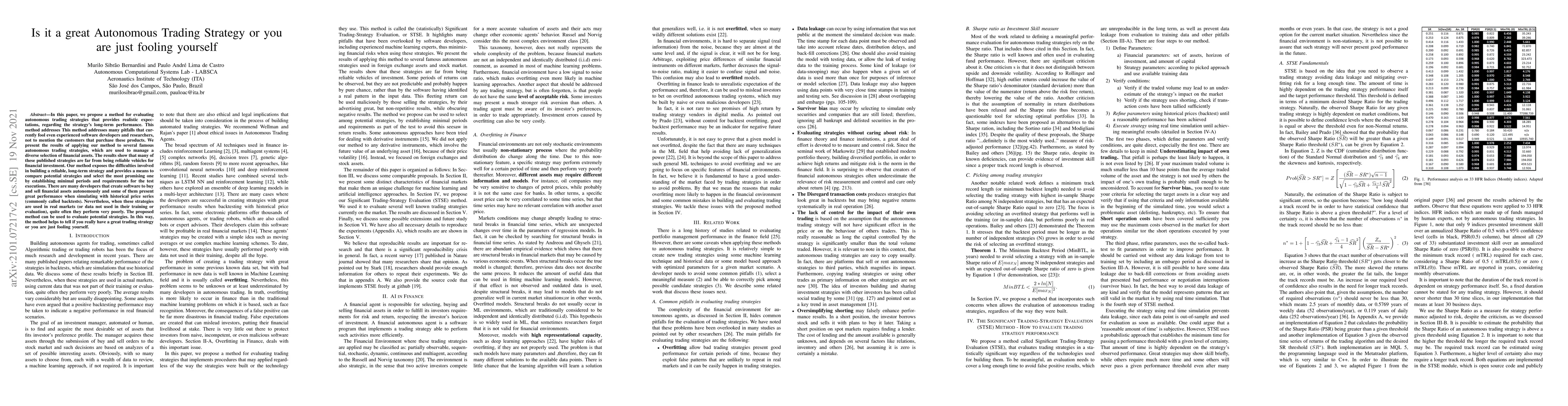 In this paper, we propose a method for evaluating autonomous trading strategies that provides realistic expectations, regarding the strategy's long-term performance. This method addresses This method addresses many pitfalls that currently fool even experienced software developers and researchers, not to mention the customers that purchase these products. We present the results of applying our method to several famous autonomous trading strategies, which are used to manage a diverse selection of financial assets. The results show that many of these published strategies are far from being reliable vehicles for financial investment. Our method exposes the difficulties involved in building a reliable, long-term strategy and provides a means to compare potential strategies and select the most promising one by establishing minimal periods and requirements for the test executions. There are many developers that create software to buy and sell financial assets autonomously and some of them present great performance when simulating with historical price series (commonly called backtests). Nevertheless, when these strategies are used in real markets (or data not used in their training or evaluation), quite often they perform very poorly. The proposed method can be used to evaluate potential strategies. In this way, the method helps to tell if you really have a great trading strategy or you are just fooling yourself.