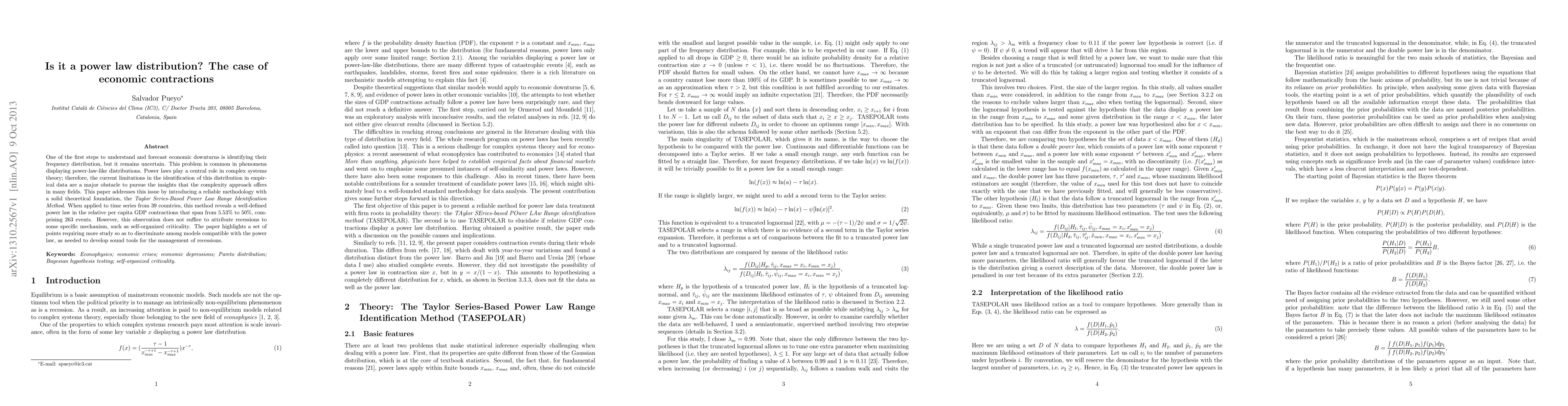 One of the first steps to understand and forecast economic downturns is identifying their frequency distribution, but it remains uncertain. This problem is common in phenomena displaying power-law-like distributions. Power laws play a central role in complex systems theory; therefore, the current limitations in the identification of this distribution in empirical data are a major obstacle to pursue the insights that the complexity approach offers in many fields. This paper addresses this issue by introducing a reliable methodology with a solid theoretical foundation, the Taylor Series-Based Power Law Range Identification Method. When applied to time series from 39 countries, this method reveals a well-defined power law in the relative per capita GDP contractions that span from 5.53% to 50%, comprising 263 events. However, this observation does not suffice to attribute recessions to some specific mechanism, such as self-organized criticality. The paper highlights a set of points requiring more study so as to discriminate among models compatible with the power law, as needed to develop sound tools for the management of recessions.