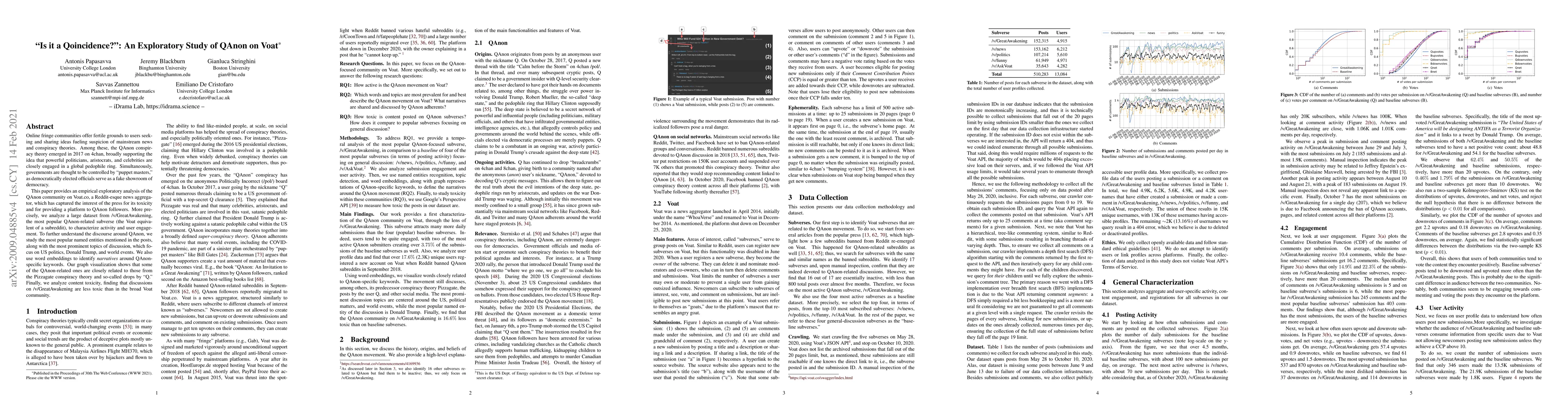 Online fringe communities offer fertile grounds for users seeking and sharing ideas fueling suspicion of mainstream news and conspiracy theories. Among these, the QAnon conspiracy theory emerged in 2017 on 4chan, broadly supporting the idea that powerful politicians, aristocrats, and celebrities are closely engaged in a global pedophile ring. Simultaneously, governments are thought to be controlled by "puppet masters," as democratically elected officials serve as a fake showroom of democracy. This paper provides an empirical exploratory analysis of the QAnon community on Voat.co, a Reddit-esque news aggregator, which has captured the interest of the press for its toxicity and for providing a platform to QAnon followers. More precisely, we analyze a large dataset from /v/GreatAwakening, the most popular QAnon-related subverse (the Voat equivalent of a subreddit), to characterize activity and user engagement. To further understand the discourse around QAnon, we study the most popular named entities mentioned in the posts, along with the most prominent topics of discussion, which focus on US politics, Donald Trump, and world events. We also use word embeddings to identify narratives around QAnon-specific keywords. Our graph visualization shows that some of the QAnon-related ones are closely related to those from the Pizzagate conspiracy theory and so-called drops by "Q." Finally, we analyze content toxicity, finding that discussions on /v/GreatAwakening are less toxic than in the broad Voat community.