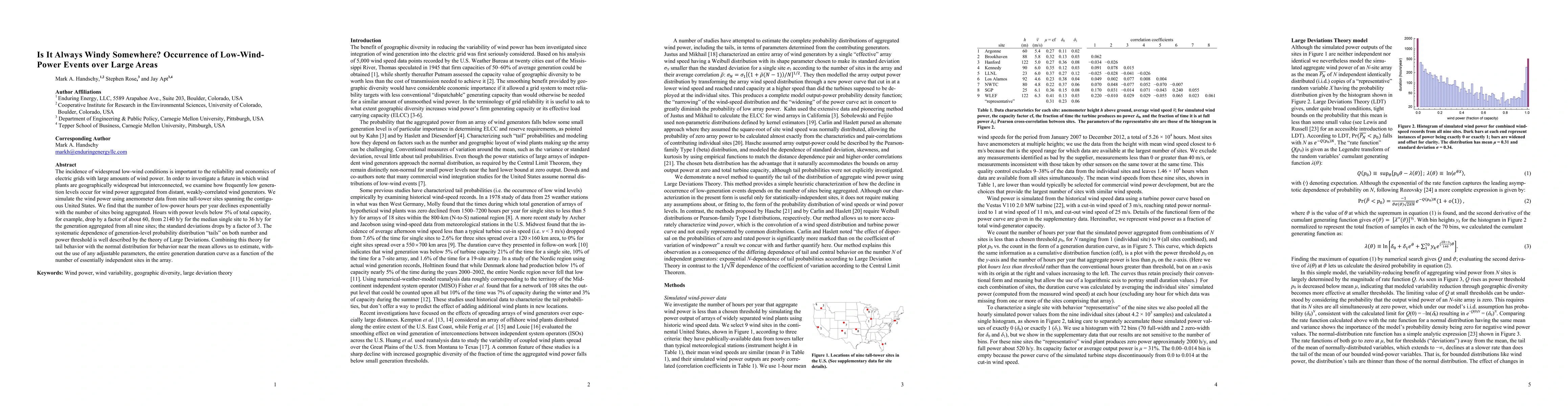 This research examines wind power generation from distant, weakly-correlated wind generators across the US. Findings show that the frequency of low-wind periods decreases exponentially with the number of sites aggregated, significantly reducing hours of low power output. The behavior is well-described by Large Deviations theory, enabling accurate estimation of generation duration curves based on the number of independent sites.