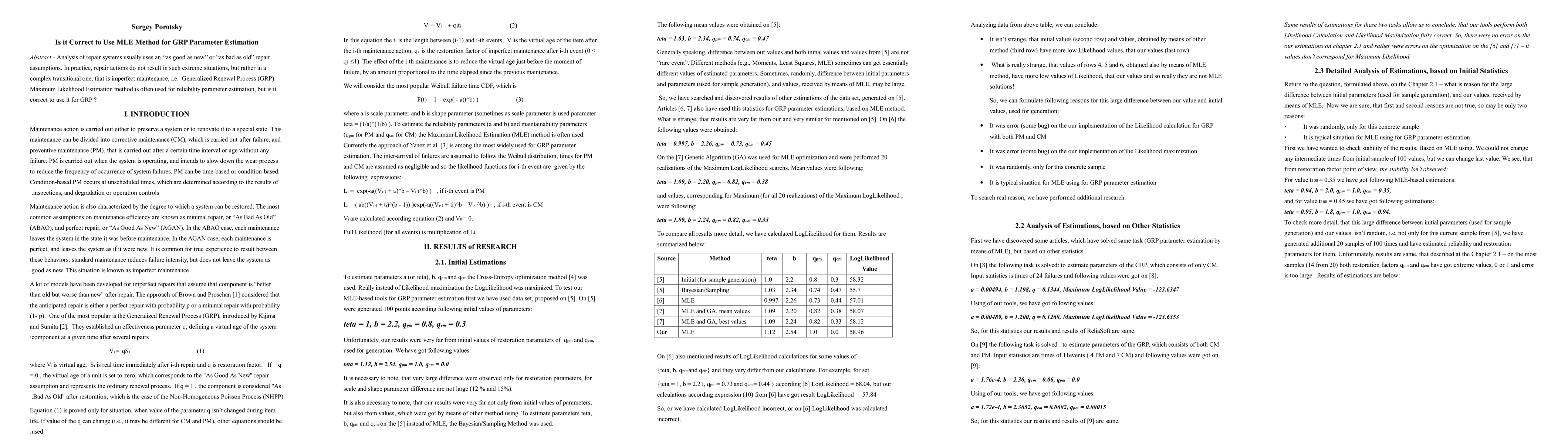 Analysis of repair systems usually uses an As Good As New or As Bad As Old repair assumptions. In practice, repair actions do not result in such extreme situations, but rather in a complex transitional one, that is imperfect maintenance, i.e. Generalized Renewal Process. Maximum Likelihood Estimation method is often used for reliability parameter estimation, but is it correct to use it for Generalized Renewal Process