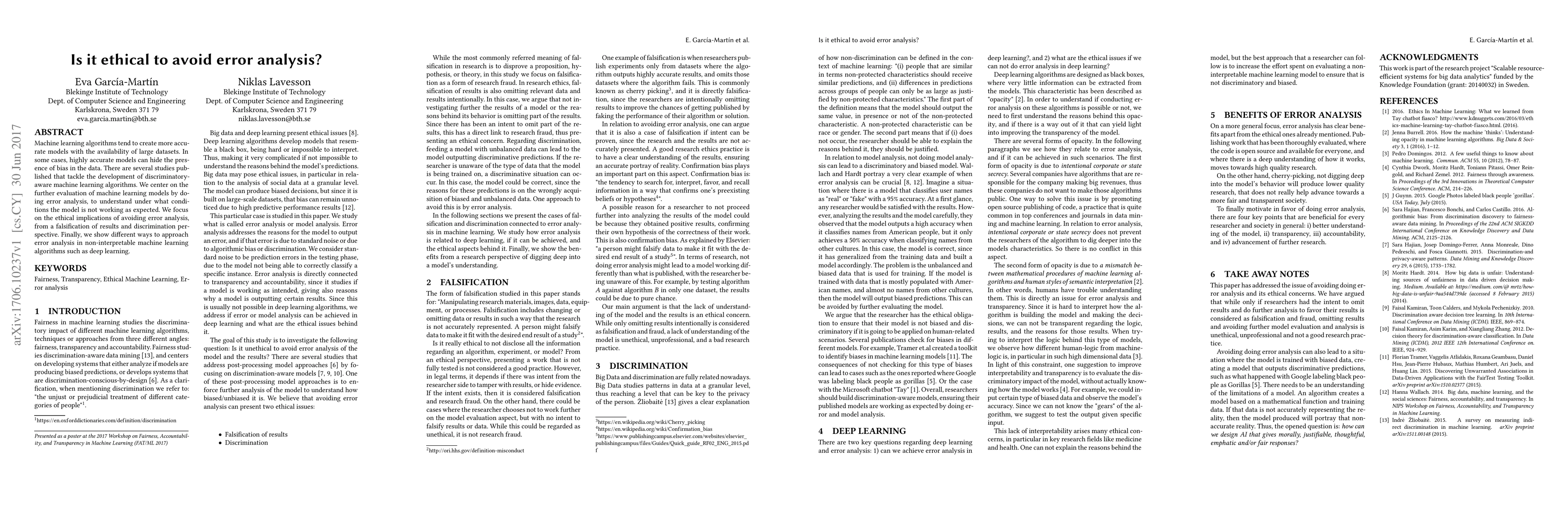 Machine learning algorithms tend to create more accurate models with the availability of large datasets. In some cases, highly accurate models can hide the presence of bias in the data. There are several studies published that tackle the development of discriminatory-aware machine learning algorithms. We center on the further evaluation of machine learning models by doing error analysis, to understand under what conditions the model is not working as expected. We focus on the ethical implications of avoiding error analysis, from a falsification of results and discrimination perspective. Finally, we show different ways to approach error analysis in non-interpretable machine learning algorithms such as deep learning.