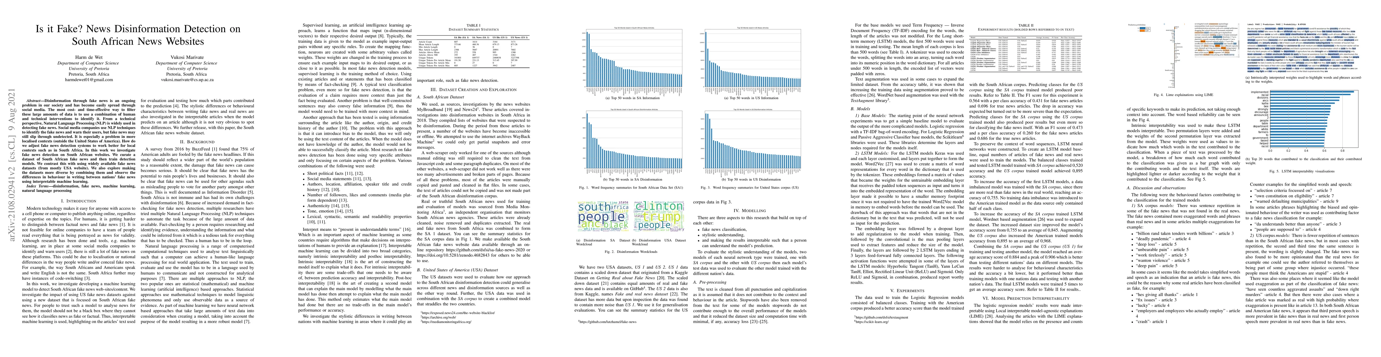 Disinformation through fake news is an ongoing problem in our society and has become easily spread through social media. The most cost and time effective way to filter these large amounts of data is to use a combination of human and technical interventions to identify it. From a technical perspective, Natural Language Processing (NLP) is widely used in detecting fake news. Social media companies use NLP techniques to identify the fake news and warn their users, but fake news may still slip through undetected. It is especially a problem in more localised contexts (outside the United States of America). How do we adjust fake news detection systems to work better for local contexts such as in South Africa. In this work we investigate fake news detection on South African websites. We curate a dataset of South African fake news and then train detection models. We contrast this with using widely available fake news datasets (from mostly USA website). We also explore making the datasets more diverse by combining them and observe the differences in behaviour in writing between nations' fake news using interpretable machine learning.