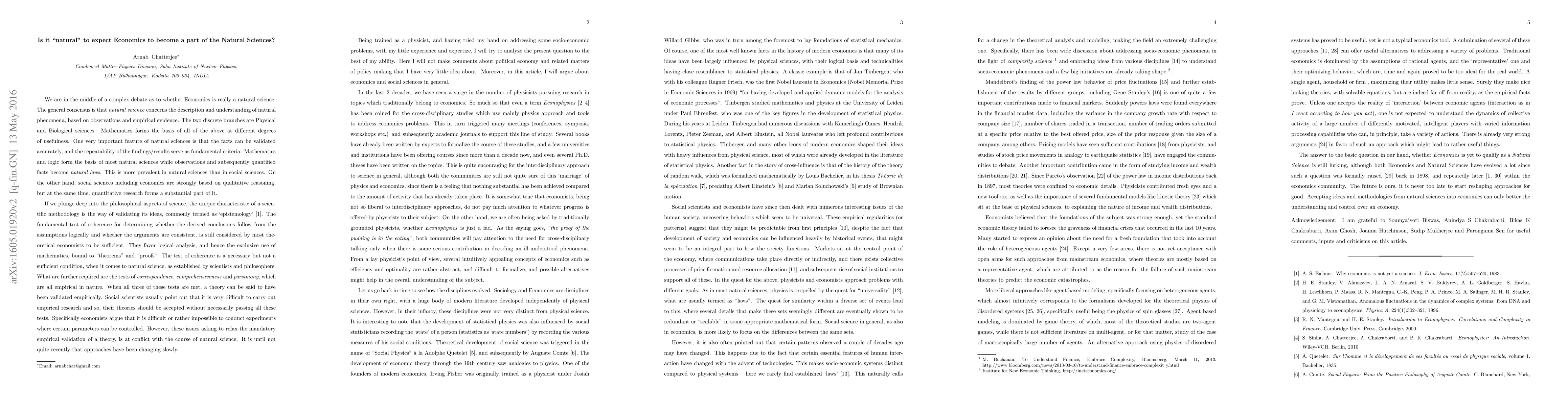 We are in the middle of a complex debate as to whether Economics is really a proper natural science. The 'Discussion & Debate' issue of this Euro. Phys. J. Special Topic volume is: 'Can economics be a Physical Science?' I discuss some aspects here.