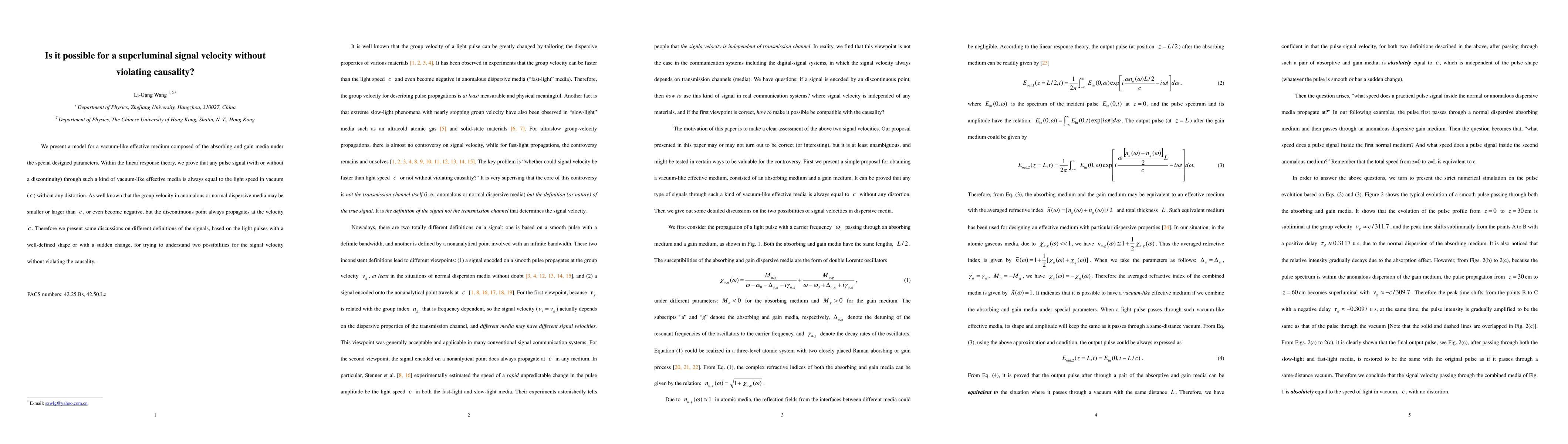 We present a model for a vacuum-like effective medium composed of the absorbing and gain media under the special designed parameters. Within the linear response theory, we prove that any pulse signal (with or without a discontinuity) through such a kind of vacuum-like effective media is always equal to the light speed in vacuum () without any distortion. As well known that the group velocity in anomalous or normal dispersive media may be smaller or larger than, or even become negative, but the discontinuous point always propagates at the velocity . Therefore we present some discussions on different definitions of the signals, based on the light pulses with a well-defined shape or with a sudden change, for trying to understand two possibilities for the signal velocity without violating the causality.