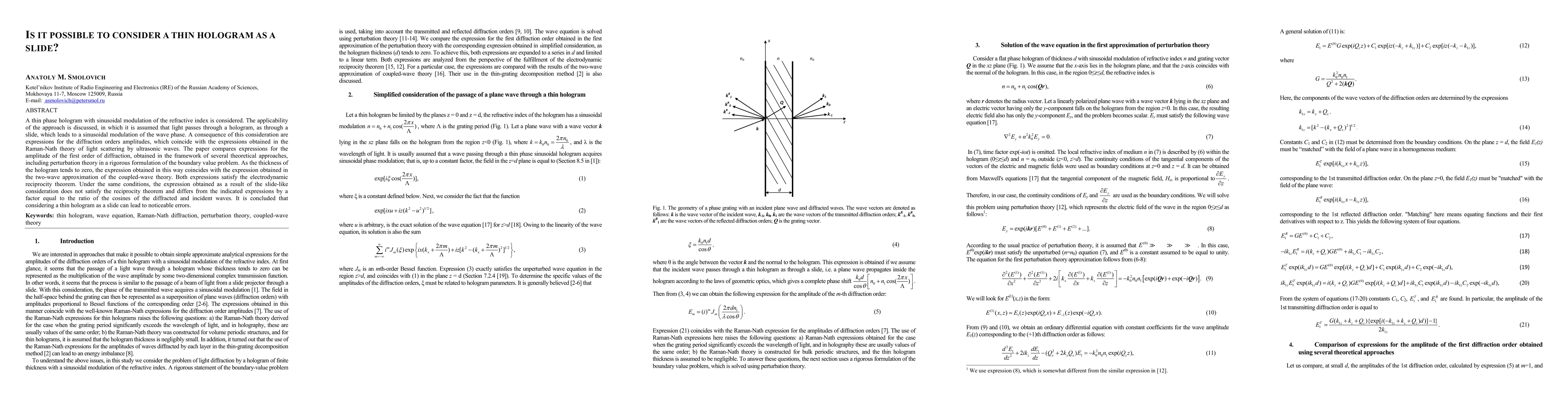 This paper explores treating a thin phase hologram as a slide, finding that while the approach yields expressions similar to Raman-Nath theory, it fails to satisfy the electrodynamic reciprocity theorem and can lead to significant errors compared to rigorous theoretical approaches.