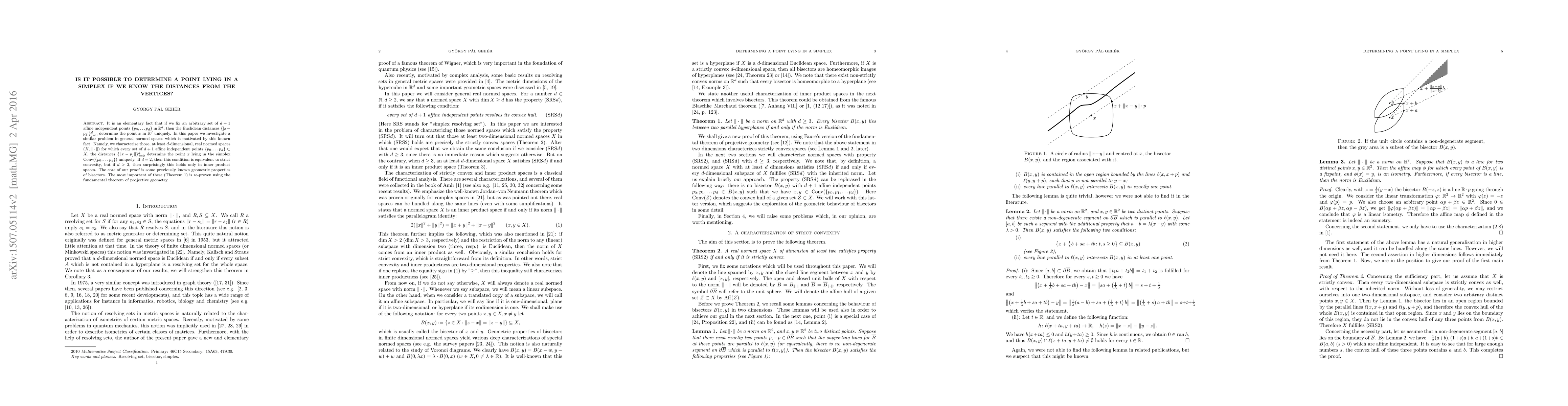 It is an elementary fact that if we fix an arbitrary set of $d+1$ affine independent points $\{p_0,\dots p_d\}$ in $\mathbb{R}^d$, then the Euclidean distances $\{|x-p_j|\}_{j=0}^d$ determine the point $x$ in $\mathbb{R}^d$ uniquely. In this paper we investigate a similar problem in general normed spaces which is motivated by this known fact. Namely, we characterize those, at least $d$-dimensional, real normed spaces $(X, \|\cdot\|)$ such that for every set of $d+1$ affine independent points $\{p_0,\dots p_d\} \subset X$, the distances $\{\|x-p_j\|\}_{j=0}^d$ determines the point $x$ lying in the simplex $\mathrm{Conv}(p_0,\dots p_d)$ uniquely. Surprisingly, the characterization depends on $d$.