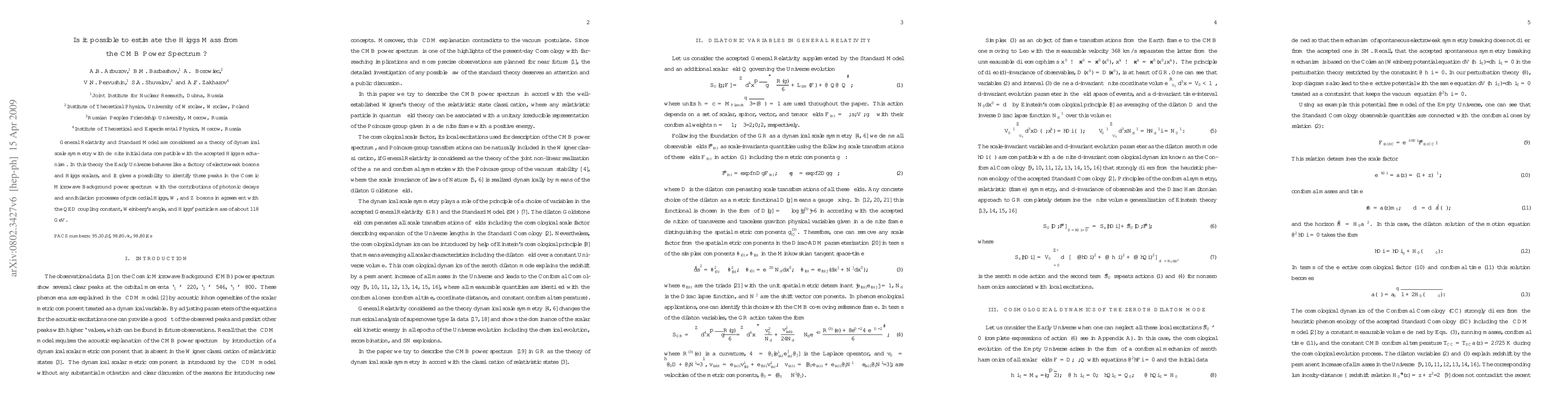 General Relativity and Standard Model are considered as a theory of dynamical scale symmetry with definite initial data compatible with the accepted Higgs mechanism. In this theory the Early Universe behaves like a factory of electroweak bosons and Higgs scalars, and it gives a possibility to identify three peaks in the Cosmic Microwave Background power spectrum with the contributions of photonic decays and annihilation processes of primordial Higgs, W, and Z bosons in agreement with the QED coupling constant, Weinberg's angle, and Higgs' particle mass of about 118 GeV.