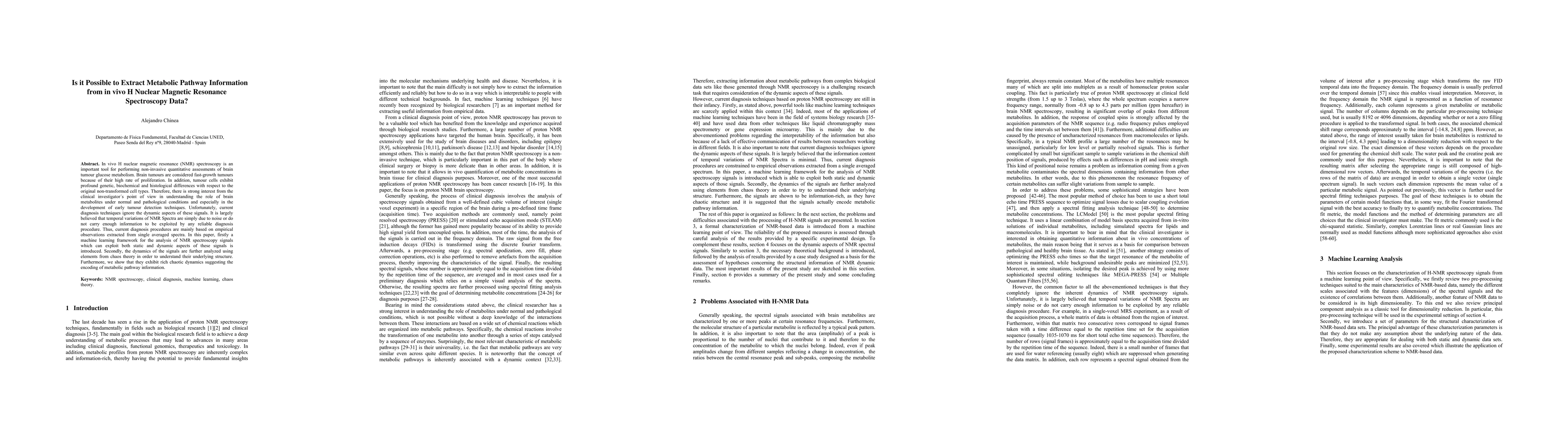 In vivo H nuclear magnetic resonance (NMR) spectroscopy is an important tool for performing non-invasive quantitative assessments of brain tumour glucose metabolism. Brain tumours are considered fast-growth tumours because of their high rate of proliferation. In addition, tumour cells exhibit profound genetic, biochemical and histological differences with respect to the original non-transformed cell types. Therefore, there is strong interest from the clinical investigator's point of view in understanding the role of brain metabolites under normal and pathological conditions and especially in the development of early tumour detection techniques. Unfortunately, current diagnosis techniques ignore the dynamic aspects of these signals. It is largely believed that temporal variations of NMR Spectra are simply due to noise or do not carry enough information to be exploited by any reliable diagnosis procedure. Thus, current diagnosis procedures are mainly based on empirical observations extracted from single averaged spectra. In this paper, firstly a machine learning framework for the analysis of NMR spectroscopy signals which can exploit both static and dynamic aspects of these signals is introduced. Secondly, the dynamics of the signals are further analyzed using elements from chaos theory in order to understand their underlying structure. Furthermore, we show that they exhibit rich chaotic dynamics suggesting the encoding of metabolic pathway information.