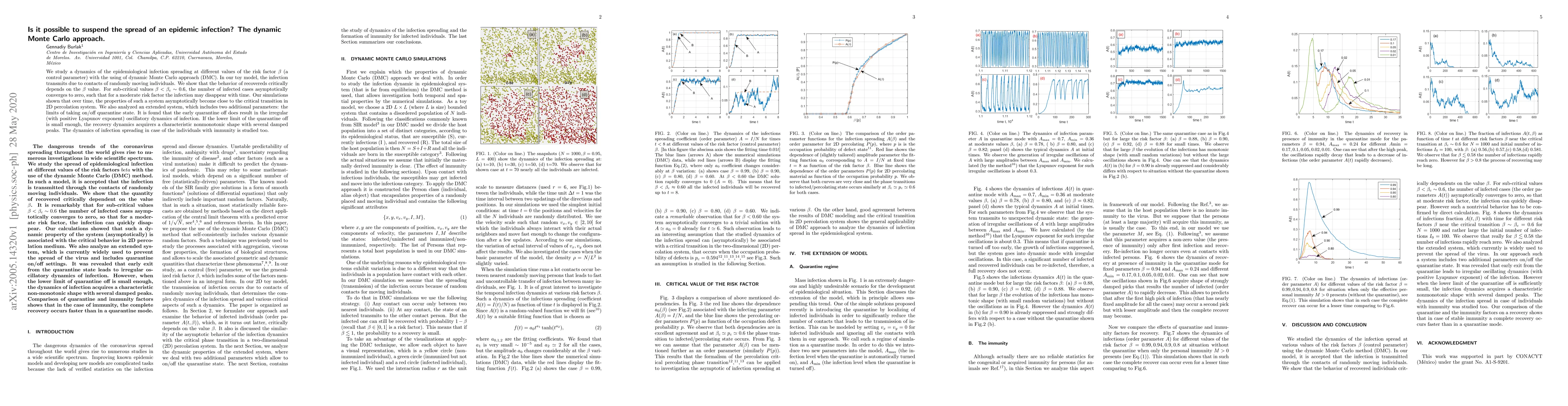 We study a dynamics of the epidemiological infection spreading at different values of the risk factor $\beta$ (a control parameter) with the using of dynamic Monte Carlo approach (DMC). In our toy model, the infection transmits due to contacts of randomly moving individuals. We show that the behavior of recovereds critically depends on the $\beta$ value. For sub-critical values $\beta<\beta_{c}\sim 0.6$, the number of infected cases asymptotically converges to zero, such that for a moderate risk factor the infection may disappear with time. Our simulations shown that over time, the properties of such a system asymptotically become close to the critical transition in 2D percolation system. We also analyzed an extended system, which includes two additional parameters: the limits of taking on/off quarantine state. It is found that the early quarantine off does result in the irregular (with positive Lyapunov exponent) oscillatory dynamics of infection. If the lower limit of the quarantine off is small enough, the recovery dynamics acquirers a characteristic nonmonotonic shape with several damped peaks. The dynamics of infection spreading in case of the individuals with immunity is studied too.