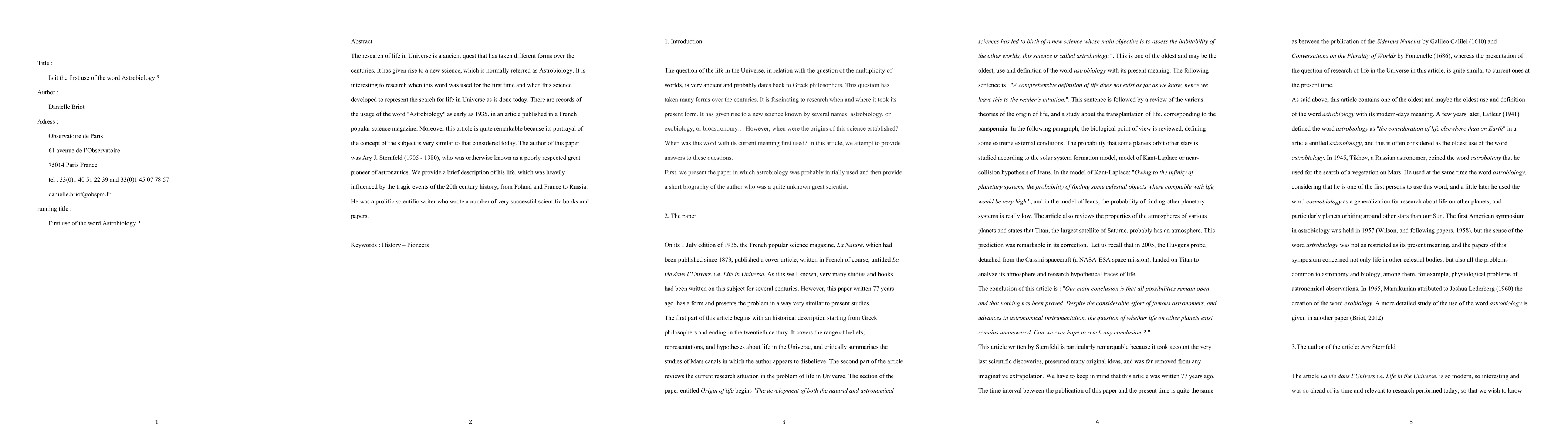 The word 'Astrobiology' was first used in a 1935 article by Ary J. Sternfeld, a prolific scientific writer who foresaw the search for life in the universe with surprising accuracy. This discovery sheds light on the early history of astrobiology and its development as a distinct science.