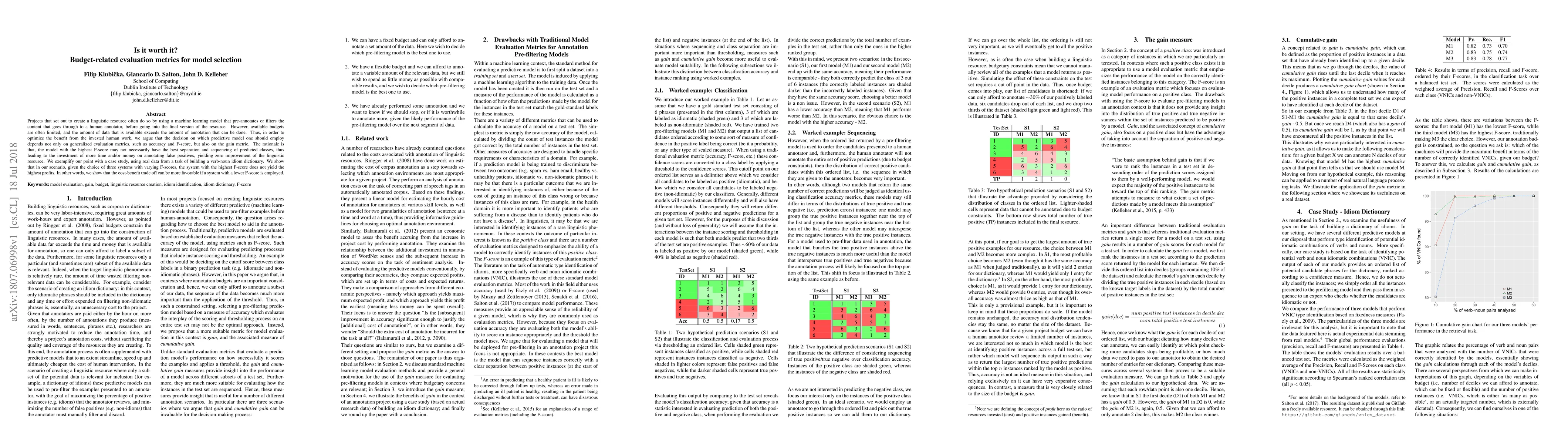 Creating a linguistic resource is often done by using a machine learning model that filters the content that goes through to a human annotator, before going into the final resource. However, budgets are often limited, and the amount of available data exceeds the amount of affordable annotation. In order to optimize the benefit from the invested human work, we argue that deciding on which model one should employ depends not only on generalized evaluation metrics such as F-score, but also on the gain metric. Because the model with the highest F-score may not necessarily have the best sequencing of predicted classes, this may lead to wasting funds on annotating false positives, yielding zero improvement of the linguistic resource. We exemplify our point with a case study, using real data from a task of building a verb-noun idiom dictionary. We show that, given the choice of three systems with varying F-scores, the system with the highest F-score does not yield the highest profits. In other words, in our case the cost-benefit trade off is more favorable for a system with a lower F-score.