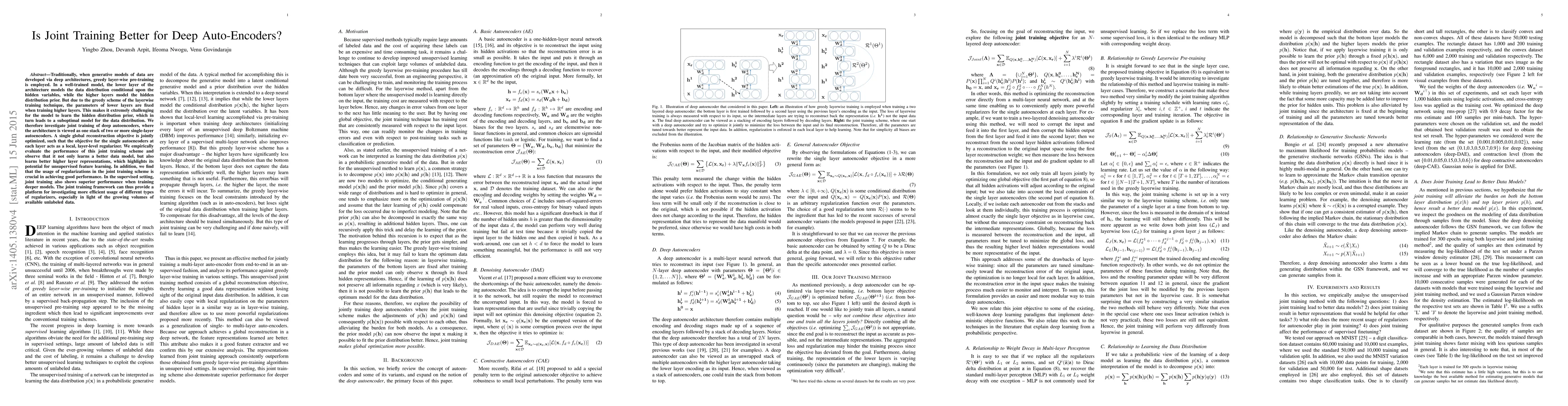 The paper explores joint training for deep autoencoders, challenging the traditional greedy layer-wise pre-training. It finds that joint training improves data modeling and higher layer representations, suggesting its potential for unsupervised feature learning. Regularization in joint training is crucial for performance, and it also shows superiority in supervised settings for deeper models, offering a platform for efficient regularizer use with growing unlabeled data.