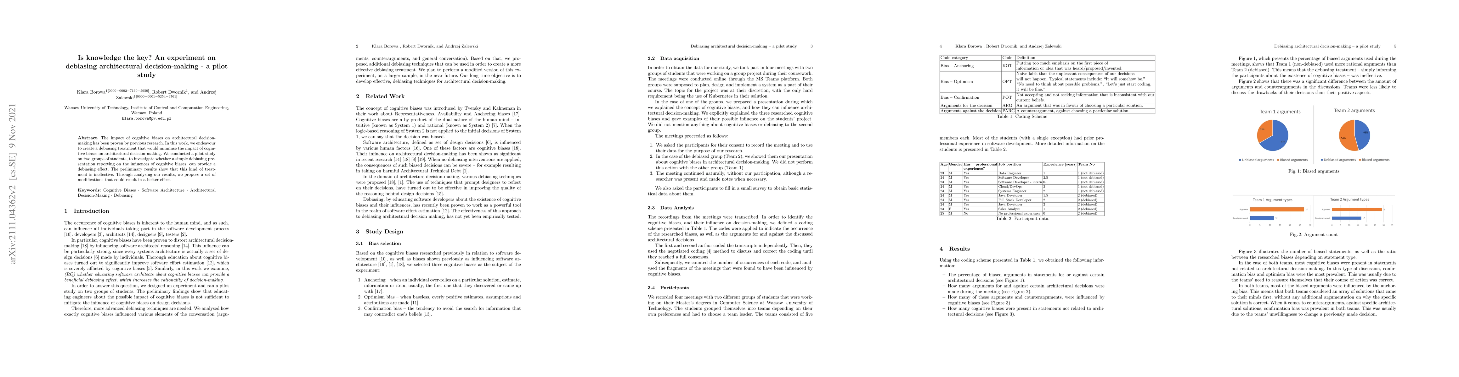 The impact of cognitive biases on architectural decision-making has been proven by previous research. In this work, we endeavour to create a debiasing treatment that would minimise the impact of cognitive biases on architectural decision-making. We conducted a pilot study on two groups of students, to investigate whether a simple debiasing presentation reporting on the influences of cognitive biases, can provide a debiasing effect. The preliminary results show that this kind of treatment is ineffective. Through analysing our results, we propose a set of modifications that could result in a better effect.
