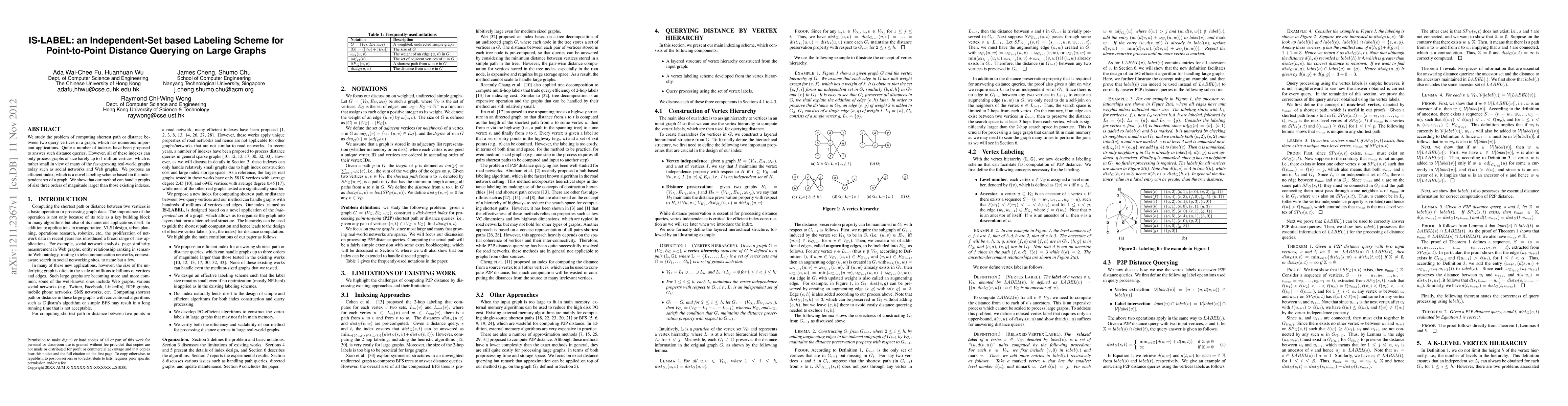 We study the problem of computing shortest path or distance between two query vertices in a graph, which has numerous important applications. Quite a number of indexes have been proposed to answer such distance queries. However, all of these indexes can only process graphs of size barely up to 1 million vertices, which is rather small in view of many of the fast-growing real-world graphs today such as social networks and Web graphs. We propose an efficient index, which is a novel labeling scheme based on the independent set of a graph. We show that our method can handle graphs of size three orders of magnitude larger than those existing indexes.