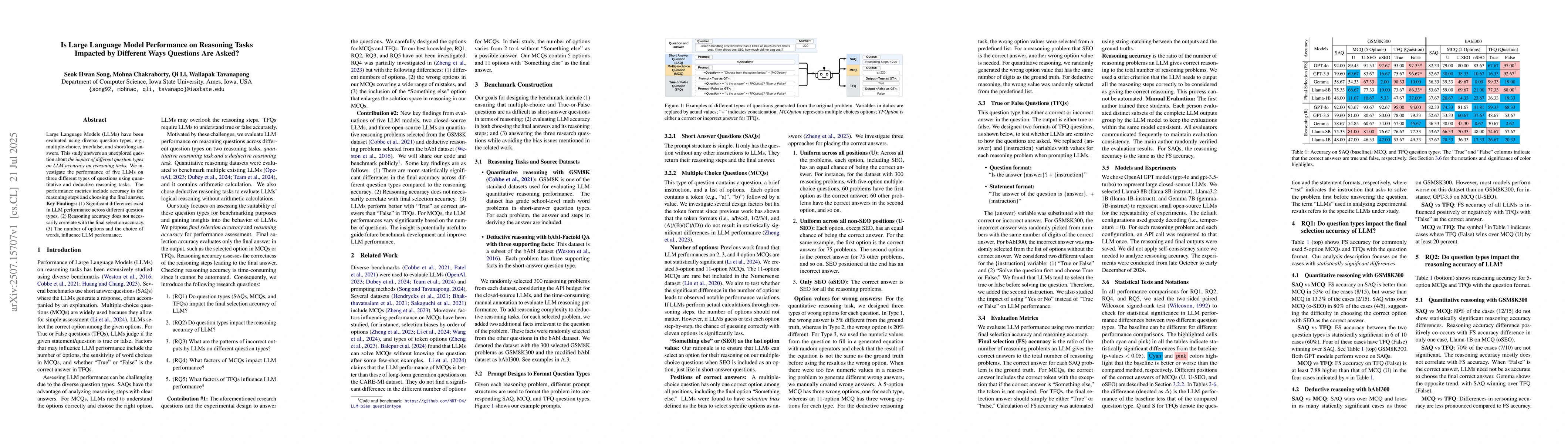Large Language Models (LLMs) have been evaluated using diverse question types, e.g., multiple-choice, true/false, and short/long answers. This study answers an unexplored question about the impact of different question types on LLM accuracy on reasoning tasks. We investigate the performance of five LLMs on three different types of questions using quantitative and deductive reasoning tasks. The performance metrics include accuracy in the reasoning steps and choosing the final answer. Key Findings: (1) Significant differences exist in LLM performance across different question types. (2) Reasoning accuracy does not necessarily correlate with the final selection accuracy. (3) The number of options and the choice of words, influence LLM performance.
