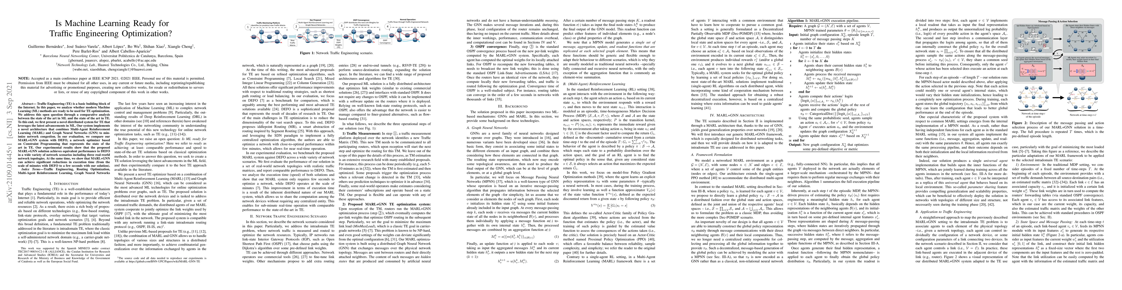 Traffic Engineering (TE) is a basic building block of the Internet. In this paper, we analyze whether modern Machine Learning (ML) methods are ready to be used for TE optimization. We address this open question through a comparative analysis between the state of the art in ML and the state of the art in TE. To this end, we first present a novel distributed system for TE that leverages the latest advancements in ML. Our system implements a novel architecture that combines Multi-Agent Reinforcement Learning (MARL) and Graph Neural Networks (GNN) to minimize network congestion. In our evaluation, we compare our MARL+GNN system with DEFO, a network optimizer based on Constraint Programming that represents the state of the art in TE. Our experimental results show that the proposed MARL+GNN solution achieves equivalent performance to DEFO in a wide variety of network scenarios including three real-world network topologies. At the same time, we show that MARL+GNN can achieve significant reductions in execution time (from the scale of minutes with DEFO to a few seconds with our solution).