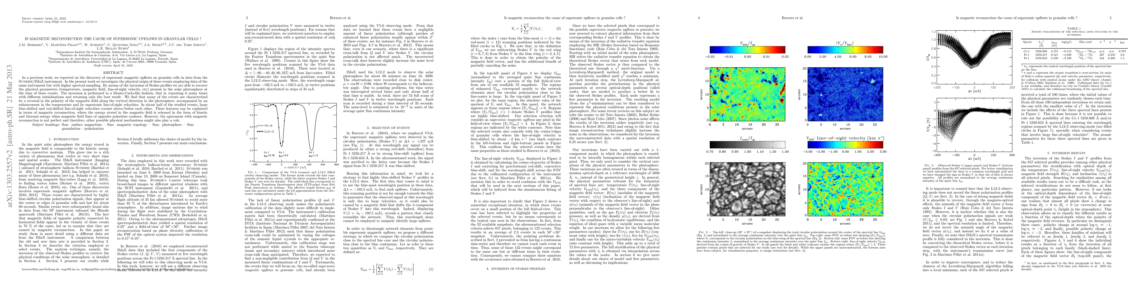 In a previous work, we reported on the discovery of supersonic magnetic upflows on granular cells in data from the {\sc Sunrise}/IMaX instrument. In the present work we investigate the physical origin of these events employing data of the same instrument but with higher spectral sampling. By means of the inversion of Stokes profiles we are able to recover the physical parameters (temperature, magnetic field, line-of-sight velocity, etc) present in the solar photosphere at the time of these events. The inversion is performed in a Monte-Carlo-like fashion, that is, repeating it many times with different initializations and retaining only the best result. We find that many of the events are characterized by a reversal in the polarity of the magnetic field along the vertical direction in the photosphere, accompanied by an enhancement in the temperature and by supersonic line-of-sight velocities. In about half of the studied events, large blue-shifted and red-shifted line-of-sight velocities coexist above/below each other. These features can be explained in terms of magnetic reconnection, where the energy stored in the magnetic field is released in the form of kinetic and thermal energy when magnetic field lines of opposite polarities coalesce. However, the agreement with magnetic reconnection is not perfect and therefore, other possible physical mechanisms might also play a role.
