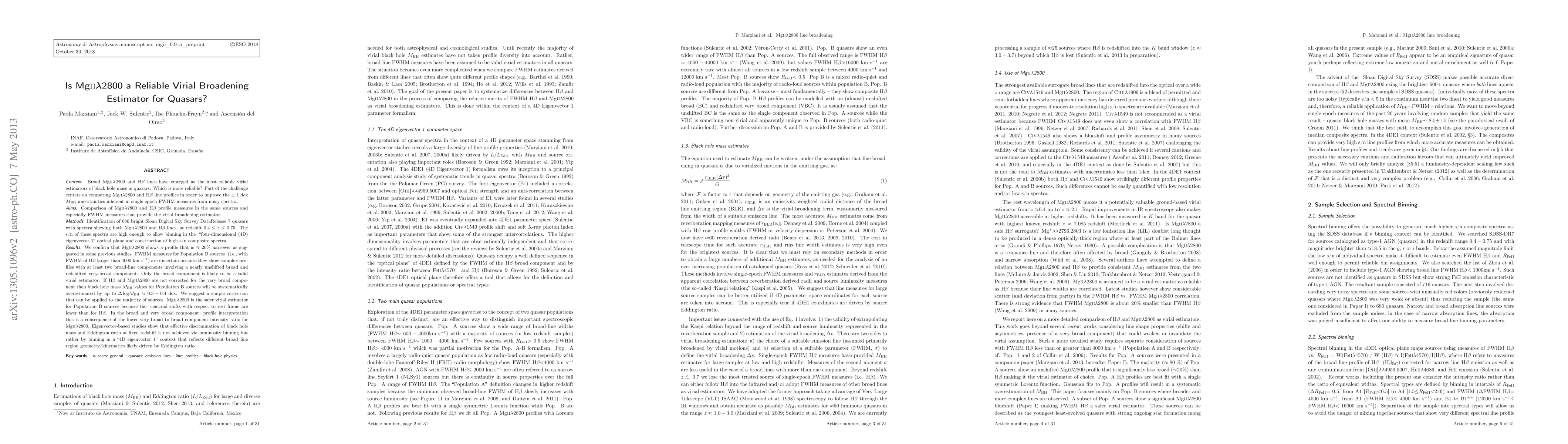 A study compares MgII 2800 and Hbeta lines as virial estimators of black hole mass in quasars, finding that MgII 2800 is a more reliable estimator for Population B sources due to its simpler profile.