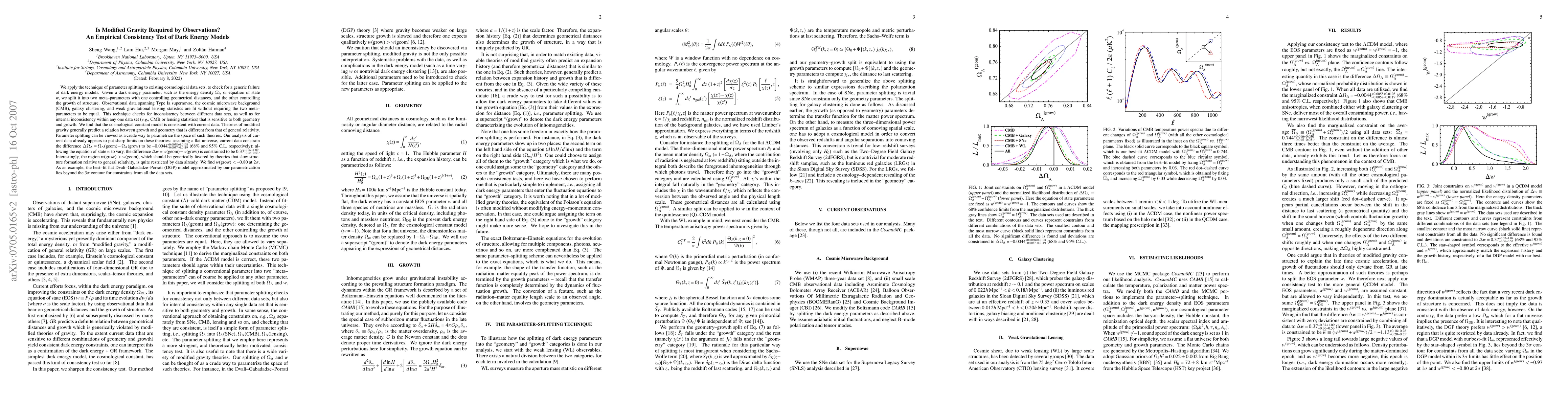 We apply the technique of parameter-splitting to existing cosmological data sets, to check for a generic failure of dark energy models. Given a dark energy parameter, such as the energy density Omega_Lambda or equation of state w, we split it into two meta-parameters with one controlling geometrical distances, and the other controlling the growth of structure. Observational data spanning Type Ia Supernovae, the cosmic microwave background (CMB), galaxy clustering, and weak gravitational lensing statistics are fit without requiring the two meta-parameters to be equal. This technique checks for inconsistency between different data sets, as well as for internal inconsistency within any one data set (e.g., CMB or lensing statistics) that is sensitive to both geometry and growth. We find that the cosmological constant model is consistent with current data. Theories of modified gravity generally predict a relation between growth and geometry that is different from that of general relativity. Parameter-splitting can be viewed as a crude way to parametrize the space of such theories. Our analysis of current data already appears to put sharp limits on these theories: assuming a flat universe, current data constrain the difference Omega_Lambda(geom) - Omega_Lambda(grow) to be -0.0044 +/- 0.0058 (68% C.L.); allowing the equation of state w to vary, the difference w(geom) - w(grow) is constrained to be 0.37 +/- 0.37 (68% C.L.). Interestingly, the region w(grow) > w(geom), which should be generically favored by theories that slow structure formation relative to general relativity, is quite restricted by data already. We find w(grow) < -0.80 at 2 sigma. As an example, the best-fit flat Dvali-Gabadadze-Porrati (DGP) model approximated by our parametrization lies beyond the 3 sigma contour for constraints from all the data sets.