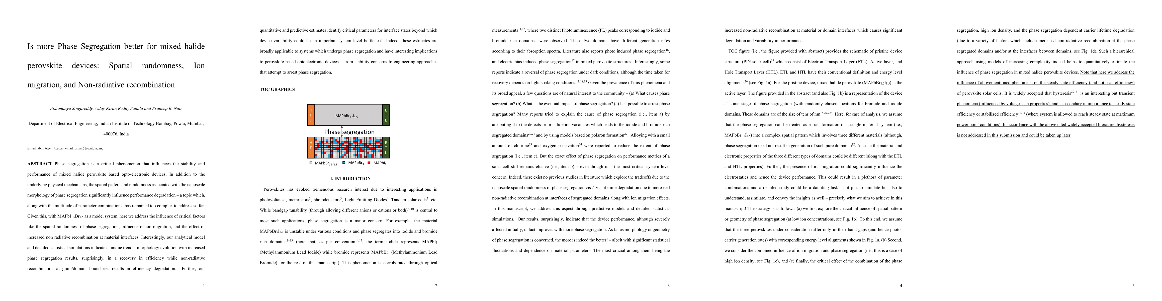 This study investigates the impact of phase segregation, ion migration, and non-radiative recombination on mixed halide perovskite devices, finding that increased spatial randomness in phase segregation surprisingly enhances device efficiency, while non-radiative recombination at grain boundaries leads to efficiency degradation. The research provides critical insights into stability and performance optimization for perovskite opto-electronic devices.