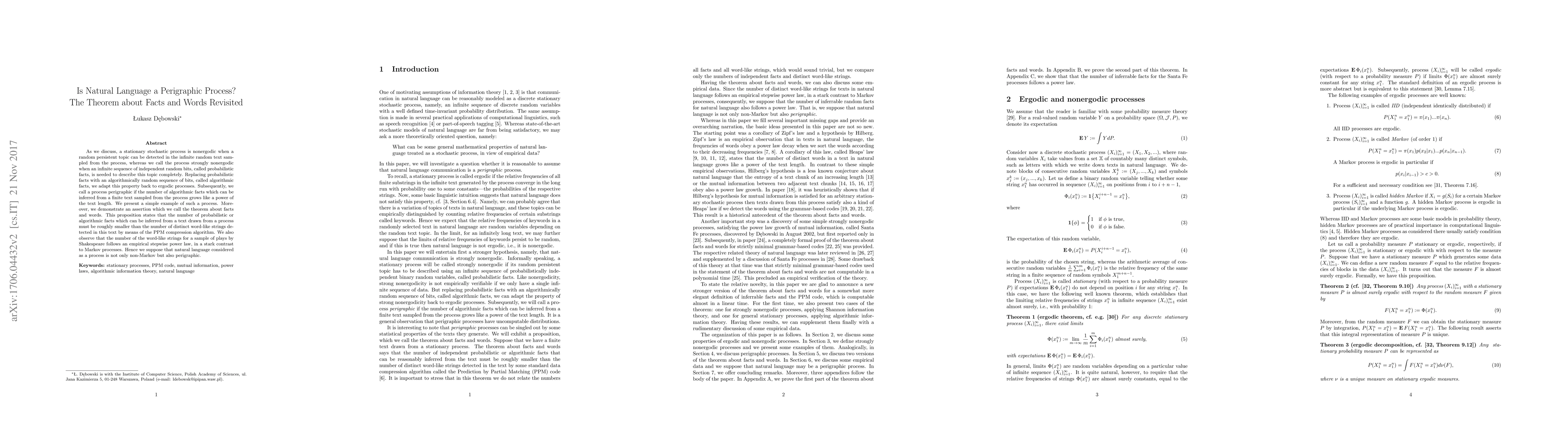 As we discuss, a stationary stochastic process is nonergodic when a random persistent topic can be detected in the infinite random text sampled from the process, whereas we call the process strongly nonergodic when an infinite sequence of independent random bits, called probabilistic facts, is needed to describe this topic completely. Replacing probabilistic facts with an algorithmically random sequence of bits, called algorithmic facts, we adapt this property back to ergodic processes. Subsequently, we call a process perigraphic if the number of algorithmic facts which can be inferred from a finite text sampled from the process grows like a power of the text length. We present a simple example of such a process. Moreover, we demonstrate an assertion which we call the theorem about facts and words. This proposition states that the number of probabilistic or algorithmic facts which can be inferred from a text drawn from a process must be roughly smaller than the number of distinct word-like strings detected in this text by means of the PPM compression algorithm. We also observe that the number of the word-like strings for a sample of plays by Shakespeare follows an empirical stepwise power law, in a stark contrast to Markov processes. Hence we suppose that natural language considered as a process is not only non-Markov but also perigraphic.