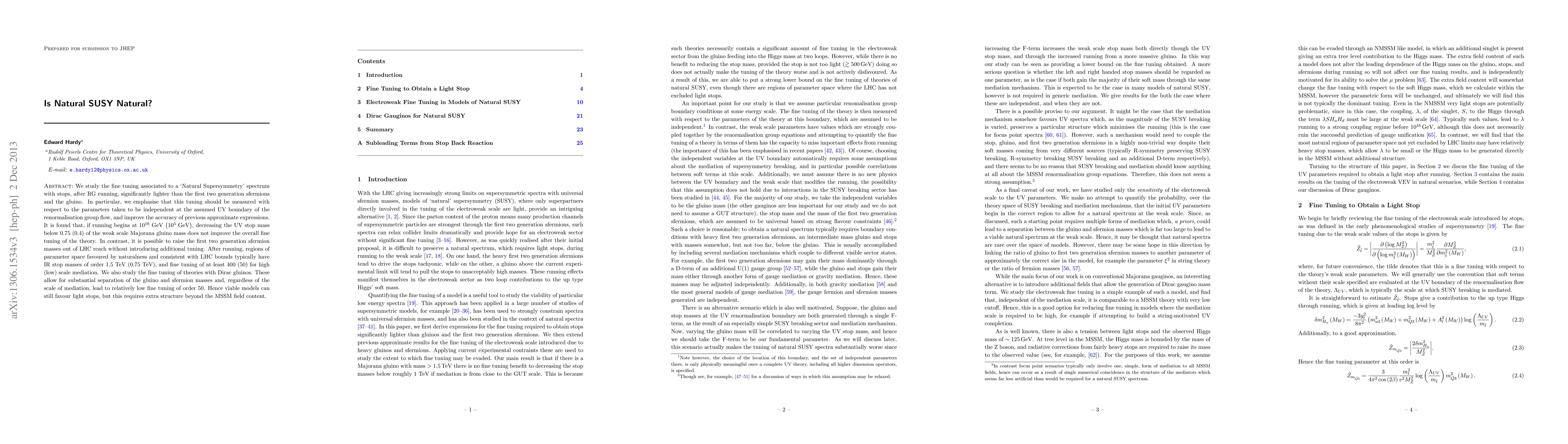 We study the fine tuning associated to a `Natural Supersymmetry' spectrum with stops, after RG running, significantly lighter than the first two generation sfermions and the gluino. In particular, we emphasise that this tuning should be measured with respect to the parameters taken to be independent at the assumed UV boundary of the renormalisation group flow, and improve the accuracy of previous approximate expressions. It is found that, if running begins at $10^{16}~\rm{GeV}$ $\left(10^5~\rm{GeV}\right)$, decreasing the UV stop mass below $0.75$ $\left(0.4\right)$ of the weak scale Majorana gluino mass does not improve the overall fine tuning of the theory. In contrast, it is possible to raise the first two generation sfermion masses out of LHC reach without introducing additional tuning. After running, regions of parameter space favoured by naturalness and consistent with LHC bounds typically have IR stop masses of order 1.5 TeV (0.75 TeV), and fine tuning of at least 400 (50) for high (low) scale mediation. We also study the fine tuning of theories with Dirac gluinos. These allow for substantial separation of the gluino and sfermion masses and, regardless of the scale of mediation, lead to relatively low fine tuning of order 50. Hence viable models can still favour light stops, but this requires extra structure beyond the MSSM field content.