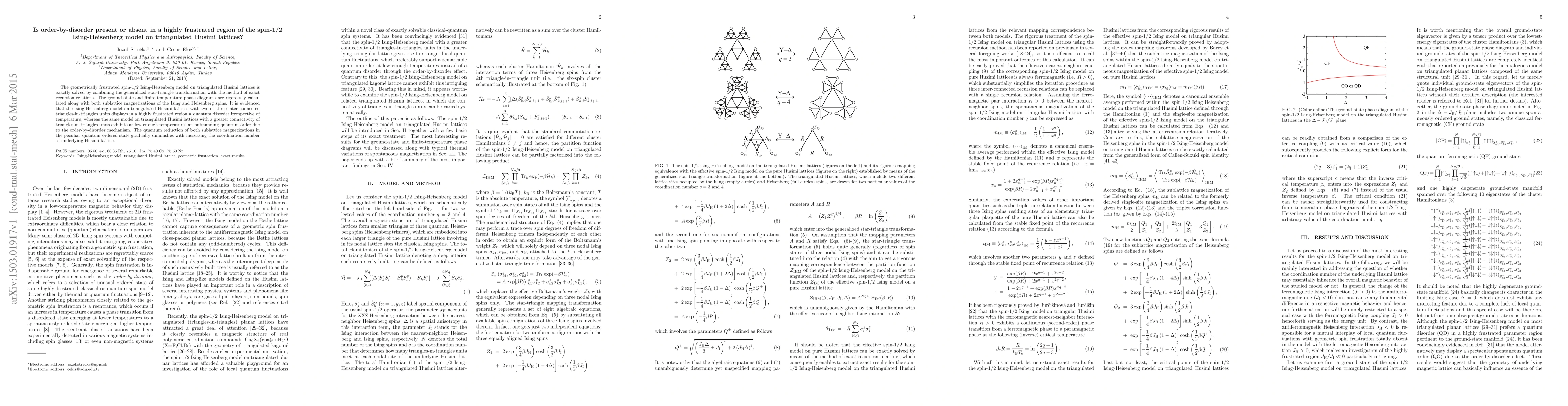This paper exactly solves the spin-1/2 Ising-Heisenberg model on triangulated Husimi lattices, revealing quantum disorder in highly frustrated regions and order-by-disorder in more connected lattices at low temperatures. The study shows that increased lattice connectivity reduces quantum order effects.