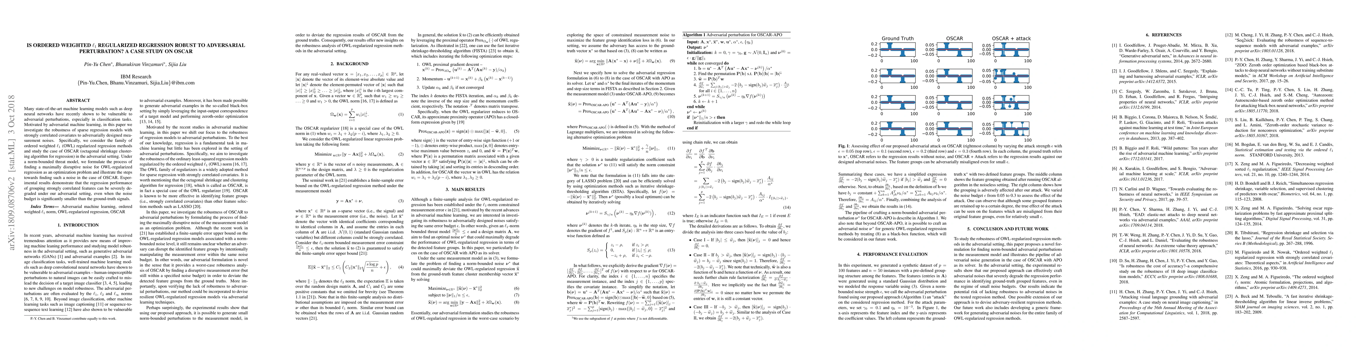 This paper investigates the robustness of ordered weighted $\ell_1$ (OWL) regularized regression, specifically OSCAR, against adversarial perturbations. Experimental results show that OSCAR's performance degrades significantly under adversarial attacks, even with small noise budgets.