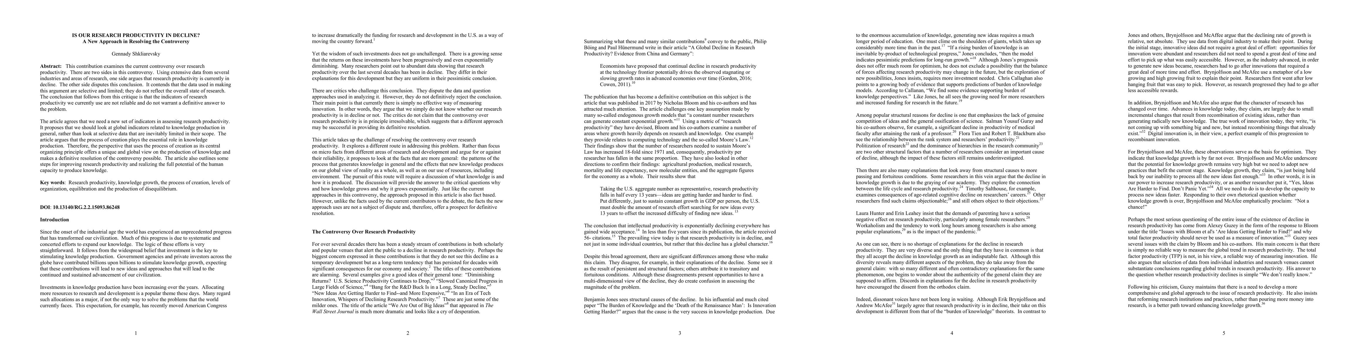 This contribution examines the current controversy over research productivity. There are two sides in this controversy. Using extensive data from several industries and areas of research, one side argues that research productivity is currently in decline. The other side disputes this conclusion. It contends that the data used in making this argument are selective and limited; they do not reflect the overall state of research. The conclusion that follows from this critique is that the indicators of research productivity we currently use are not reliable and do not warrant a definitive answer to the problem. The article agrees that we need a new set of indicators in assessing research productivity. It proposes that we should look at global indicators related to knowledge production in general, rather than look at selective data that are inevitably limited in their scope. The article argues that the process of creation plays the essential role in knowledge production. Therefore, the perspective that uses the process of creation as its central organizing principle offers a unique and global view on the production of knowledge and makes a definitive resolution of the controversy possible. The article also outlines some steps for improving research productivity and realizing the full potential of the human capacity to produce knowledge. Key words: Research productivity, knowledge growth, the process of creation, levels of organization, equilibration and the production of disequilibrium.