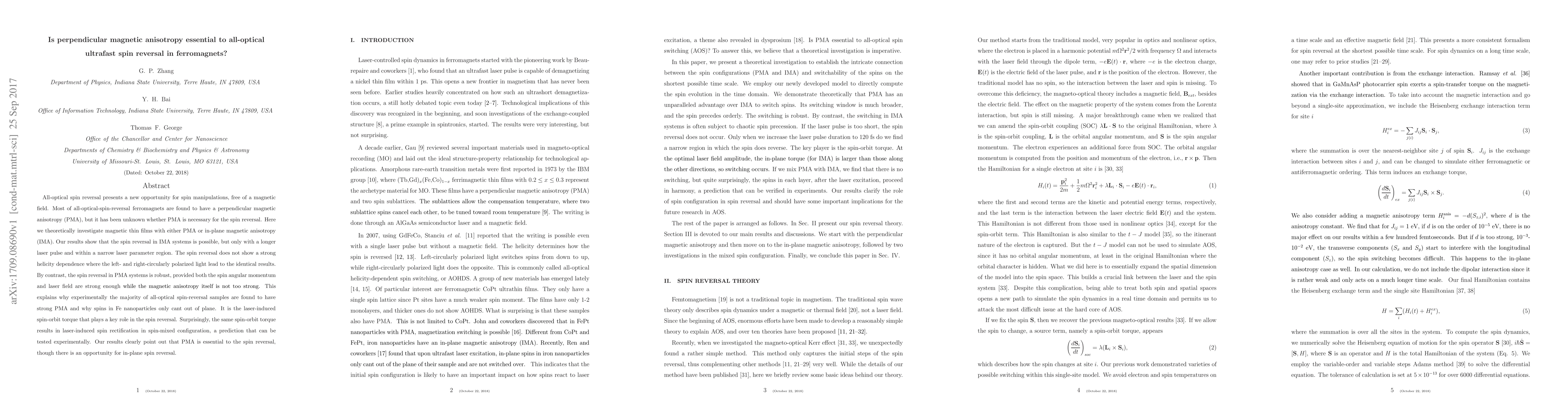 This paper investigates whether perpendicular magnetic anisotropy (PMA) is essential for all-optical ultrafast spin reversal in ferromagnets. The study finds that while spin reversal is possible in systems with in-plane magnetic anisotropy (IMA), it requires a longer laser pulse and specific conditions, whereas PMA systems exhibit robust spin reversal under stronger laser fields.