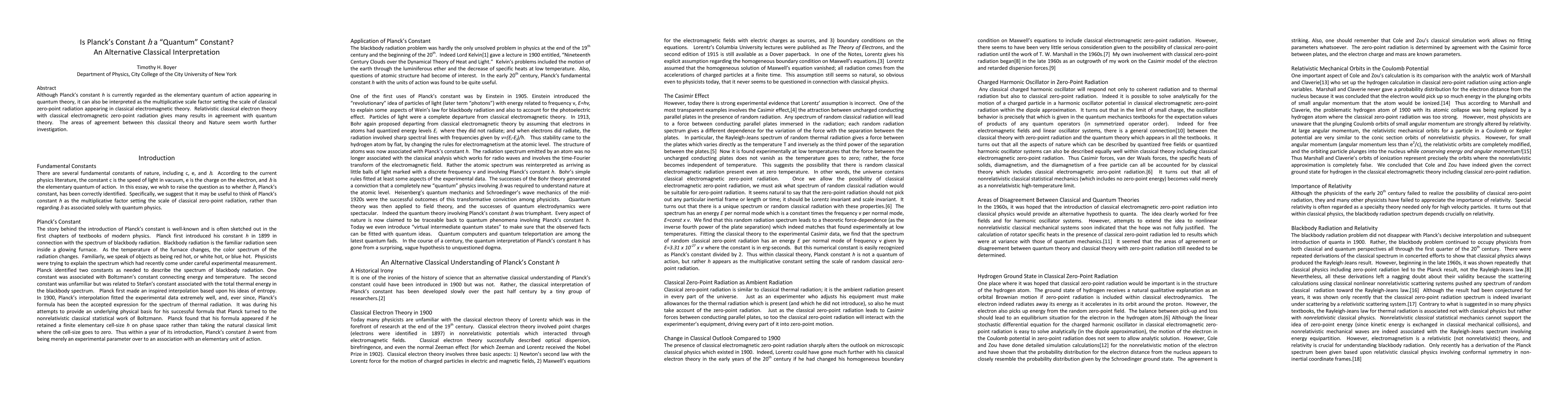 This paper proposes an alternative classical interpretation of Planck's constant h, suggesting it could also function as a scale factor for classical zero-point radiation in electromagnetic theory, yielding results similar to quantum theory. The study highlights the potential value of investigating classical relativistic electron theory in light of these findings.