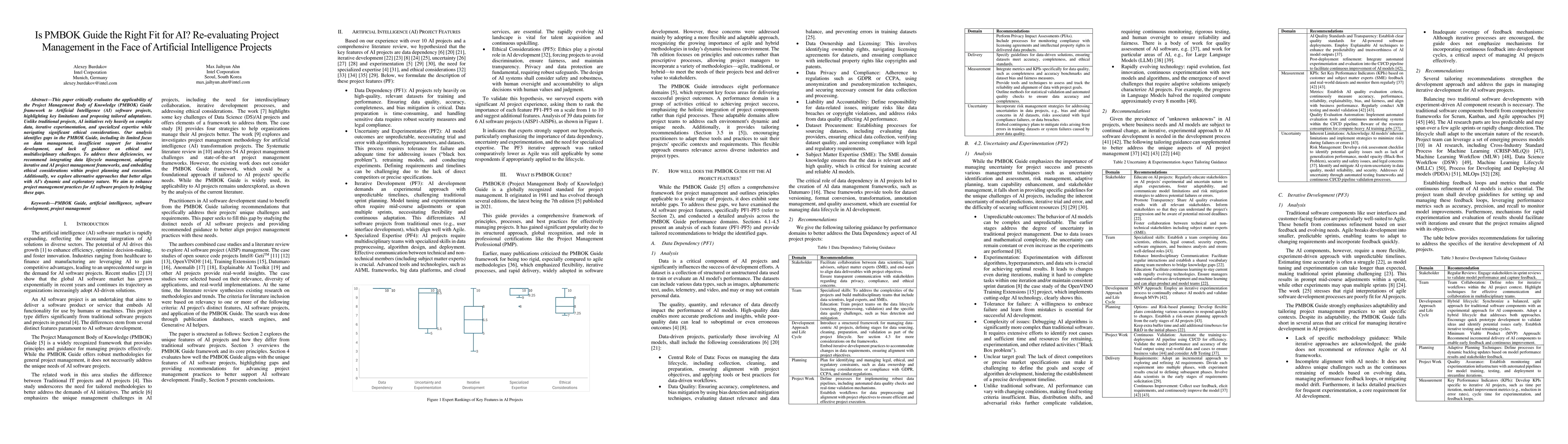 The paper critically evaluates PMBOK Guide applicability to AI projects through identification of gaps and proposal of tailored adaptations.