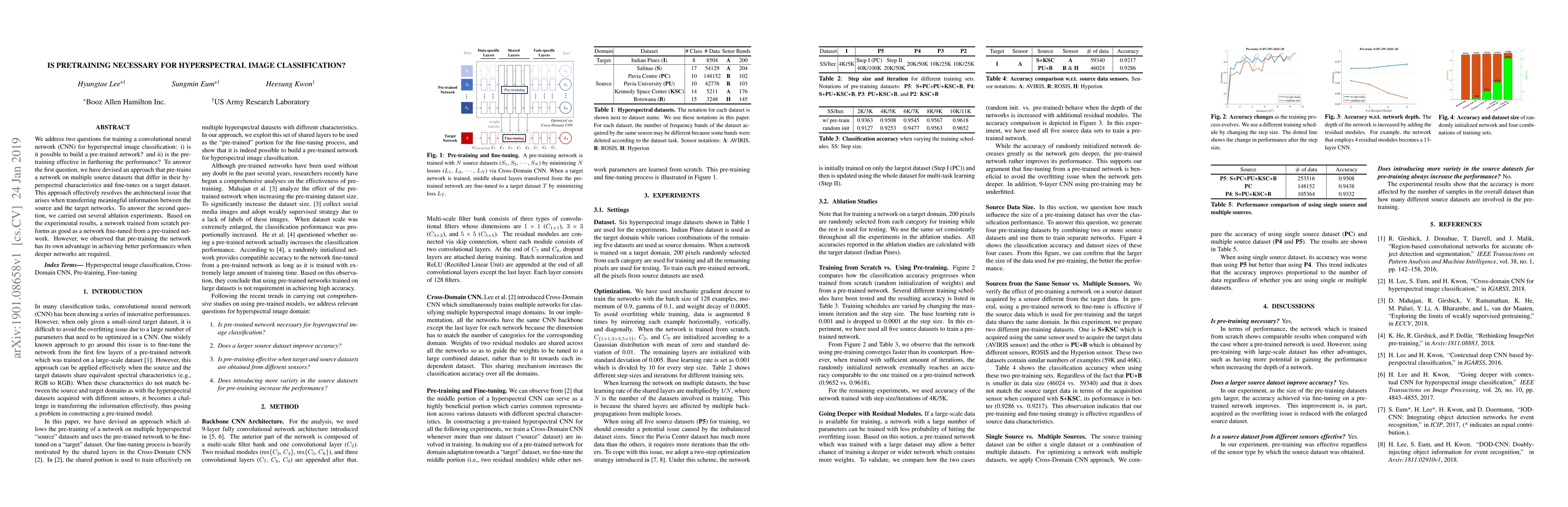 We address two questions for training a convolutional neural network (CNN) for hyperspectral image classification: i) is it possible to build a pre-trained network? and ii) is the pre-training effective in furthering the performance? To answer the first question, we have devised an approach that pre-trains a network on multiple source datasets that differ in their hyperspectral characteristics and fine-tunes on a target dataset. This approach effectively resolves the architectural issue that arises when transferring meaningful information between the source and the target networks. To answer the second question, we carried out several ablation experiments. Based on the experimental results, a network trained from scratch performs as good as a network fine-tuned from a pre-trained network. However, we observed that pre-training the network has its own advantage in achieving better performances when deeper networks are required.