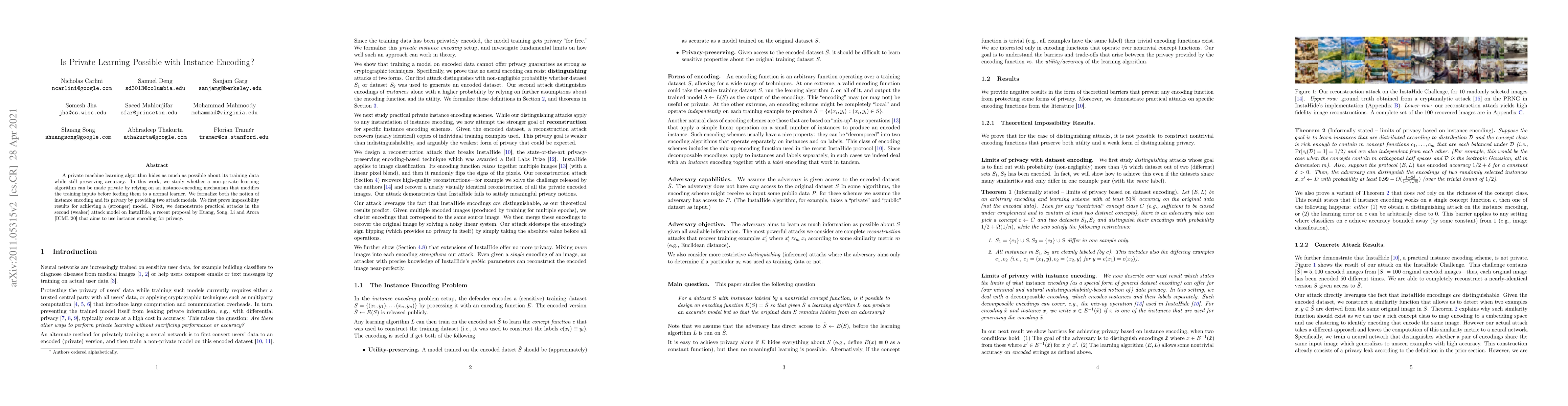 A private machine learning algorithm hides as much as possible about its training data while still preserving accuracy. In this work, we study whether a non-private learning algorithm can be made private by relying on an instance-encoding mechanism that modifies the training inputs before feeding them to a normal learner. We formalize both the notion of instance encoding and its privacy by providing two attack models. We first prove impossibility results for achieving a (stronger) model. Next, we demonstrate practical attacks in the second (weaker) attack model on InstaHide, a recent proposal by Huang, Song, Li and Arora [ICML'20] that aims to use instance encoding for privacy.