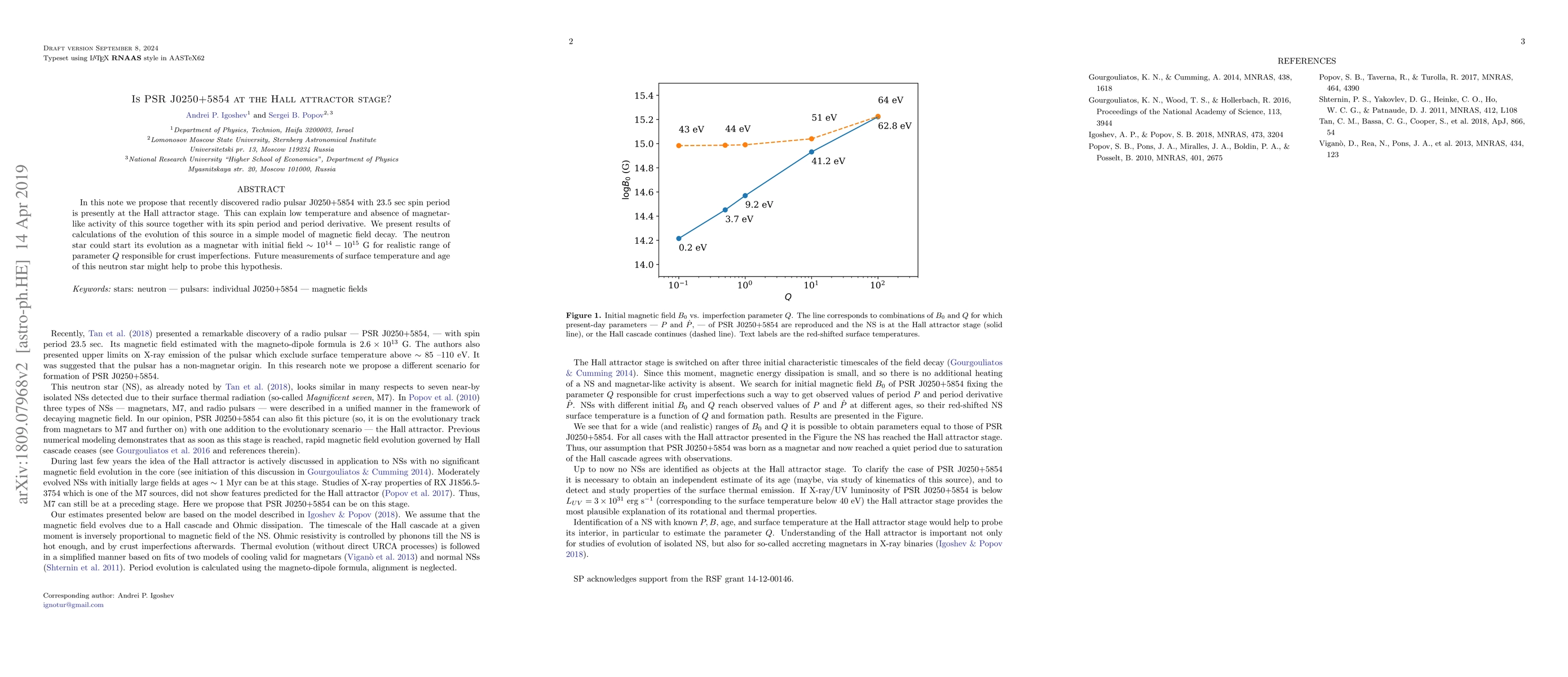 In this note we propose that recently discovered radio pulsar J0250+5854 with 23.5 sec spin period is presently at the Hall attractor stage. This can explain low temperature and absence of magnetar-like activity of this source together with its spin period and period derivative. We present results of calculations of the evolution of this source in a simple model of magnetic field decay. The neutron star could start its evolution as a magnetar with initial field $\sim 10^{14}-10^{15}$ G for realistic range of parameter $Q$ describing crust imperfections. Future measurements of surface temperature and age of this neutron star might help to probe this hypothesis.