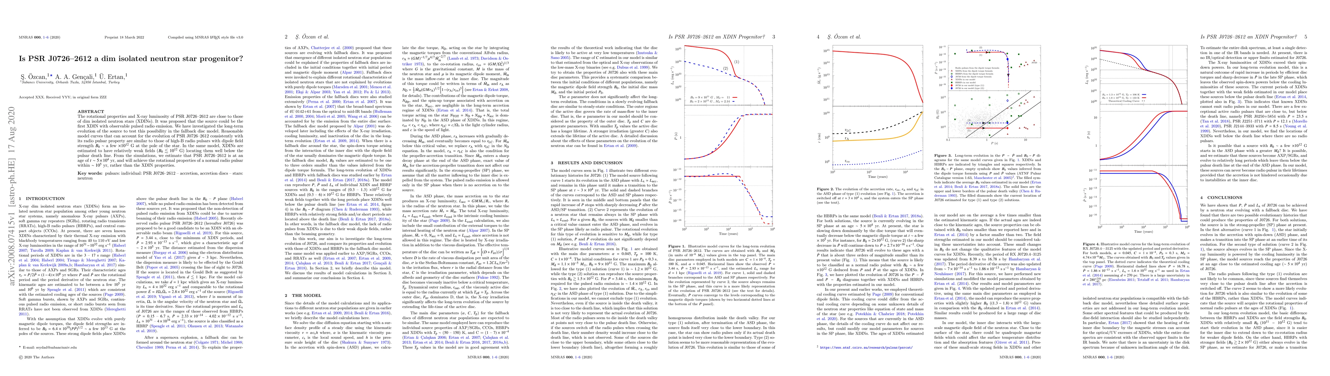 The rotational properties and X-ray luminosity of PSR J0726-2612 are close to those of dim isolated neutron stars (XDINs). It was proposed that the source could be the first XDIN with observable pulsed radio emission. We have investigated the long-term evolution of the source to test this possibility in the fallback disc model. Reasonable model curves that can account for the evolution of PSR J0726-2612 consistently with its radio pulsar property are similar to those of high-B radio pulsars with dipole field strength $B_0 \sim$ a few $\times 10^{12}~$G at the pole of the star. In the same model, XDINs are estimated to have relatively weak fields ($B_0 \lesssim 10^{12}~$G) locating them well below the pulsar death line. From the simulations, we estimate that PSR J0726-2612 is at an age of $t \sim 5 \times 10^4~$yr, and will achieve the rotational properties of a normal radio pulsar within $\sim 10^5~$yr, rather than the XDIN properties.