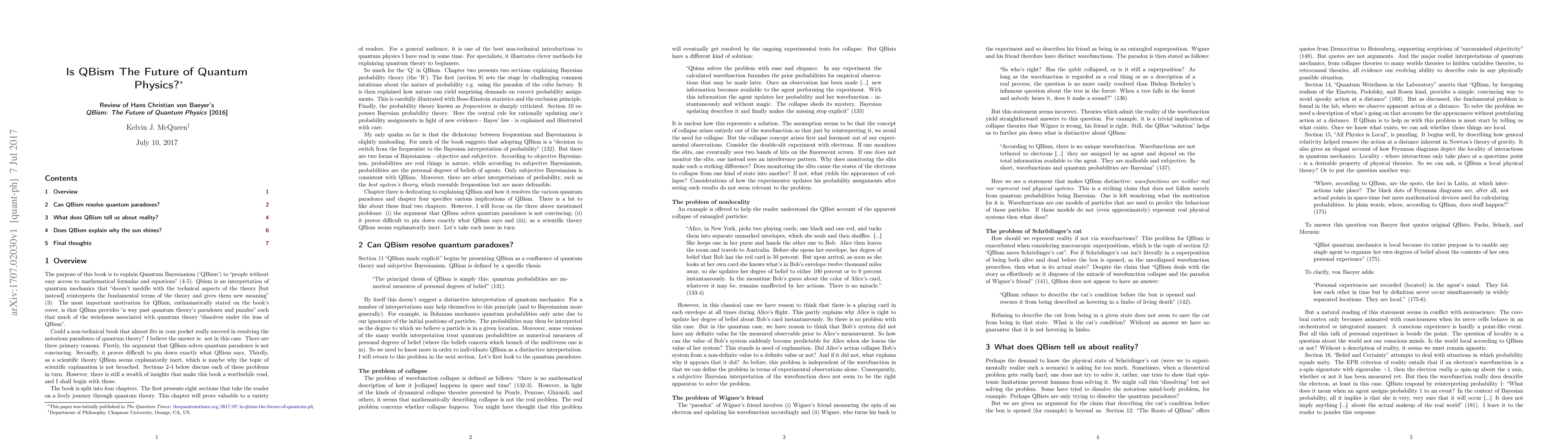 The purpose of this book is to explain Quantum Bayesianism ('QBism') to "people without easy access to mathematical formulas and equations" (4-5). Qbism is an interpretation of quantum mechanics that "doesn't meddle with the technical aspects of the theory [but instead] reinterprets the fundamental terms of the theory and gives them new meaning" (3). The most important motivation for QBism, enthusiastically stated on the book's cover, is that QBism provides "a way past quantum theory's paradoxes and puzzles" such that much of the weirdness associated with quantum theory "dissolves under the lens of QBism". Could a non-technical book that almost fits in your pocket really succeed in resolving the notorious paradoxes of quantum theory? I believe the answer is: not in this case. There are three primary reasons. Firstly, the argument that QBism solves quantum paradoxes is not convincing. Secondly, it proves difficult to pin down exactly what QBism says. Thirdly, as a scientific theory QBism seems explanatorily inert, which is maybe why the topic of scientific explanation is not broached. Sections 2-4 below discuss each of these problems in turn. However, there is still a wealth of insights that make this book a worthwhile read, and I shall begin with those.